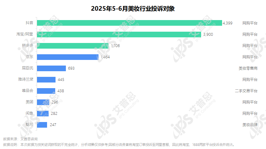 2025年5-6月,美妆行业投诉对象中被诉量最高的为抖音(4399起),较上期增长50%,淘宝/阿里被诉量3900起,较上期增长13%;拼多多、京东被诉量分别为1706起、1464起。美妆品牌魅可新入榜,被诉量247起,环比增长258%。