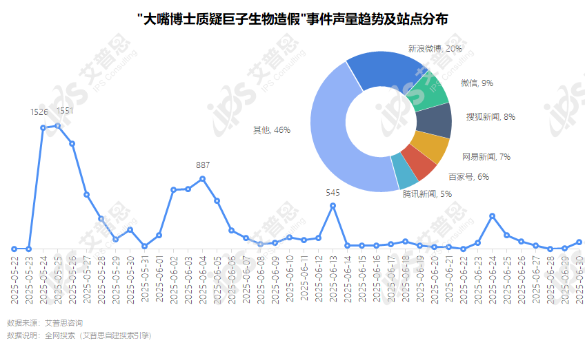 图11:“大嘴博士质疑巨子生物造假”事件声量趋势及站点分布