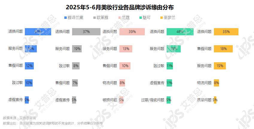 2025年5-6月全国美妆行业投诉中,由退换问题引起的投诉最多(9236起),较上期增长10%;服务问题位列第二,相关投诉量为5066起,较上期增长8%;售假问题位列第三,相关投诉量为3615起,较上期下降1%;虚假宣传相关投诉量3037起,环比增长32%,致过敏、过期/瑕疵相关投诉量分别为1464起、524起。