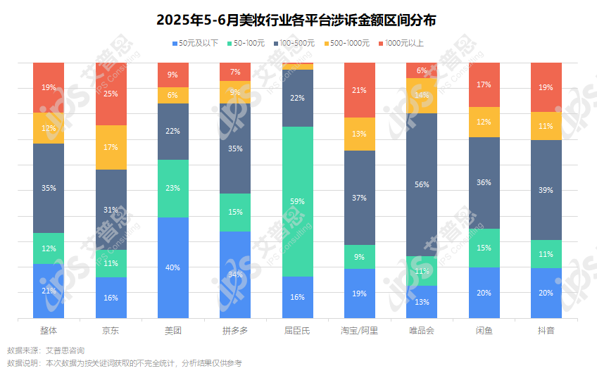 从涉诉金额来看,本期美妆行业100-500元之间的投诉量相对较多,占比35%;屈臣氏、美团、拼多多涉诉金额低于100元的投诉量较多,占比分别为75%、62%、49%;京东、淘宝/阿里涉诉金额在500元以上的投诉较多,分别占比42%、34%。