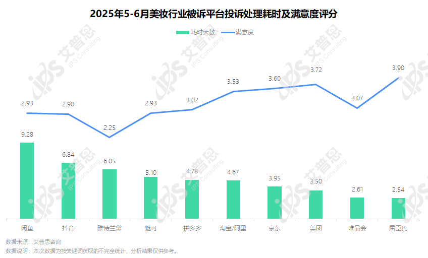 图10:2025年5-6月美妆行业被诉平台投诉处理耗时及满意度评分