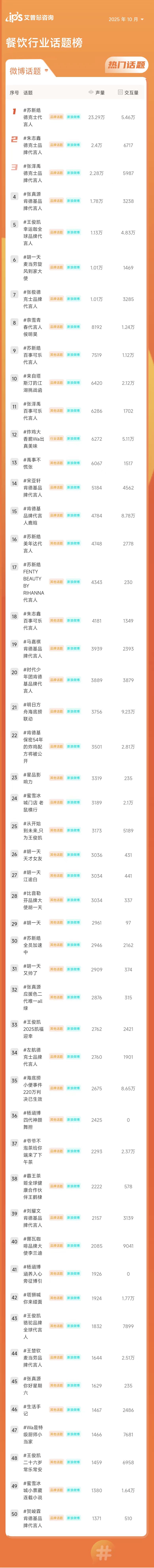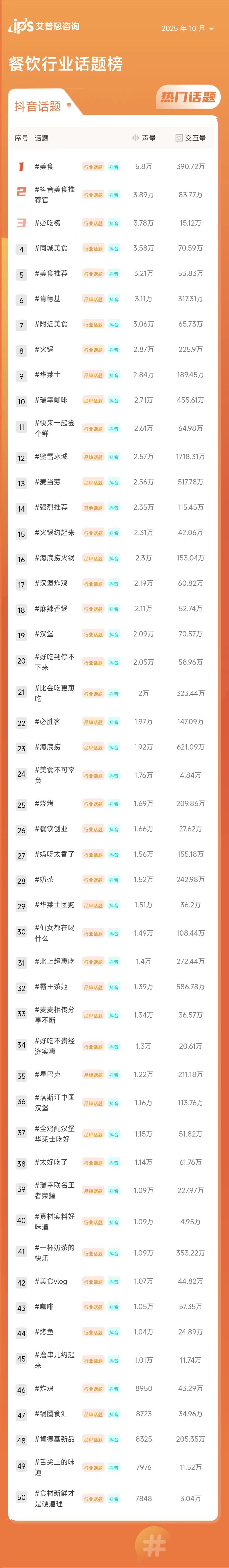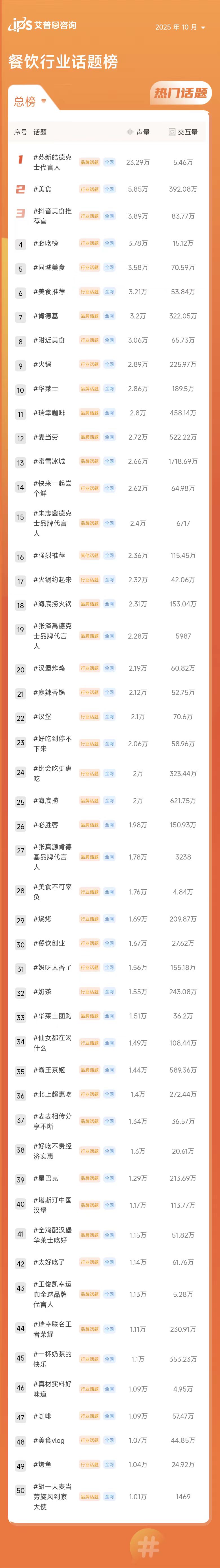 2025年10月餐饮行业排名前三的热门话题为: #苏新皓德克士代言人(品牌话题,声量23.29万,交互量5.46万)、#美食(行业话题,声量5.85万,交互量392.08万)、#抖音美食推荐官(行业话题,声量3.89万,交互量83.77万)。