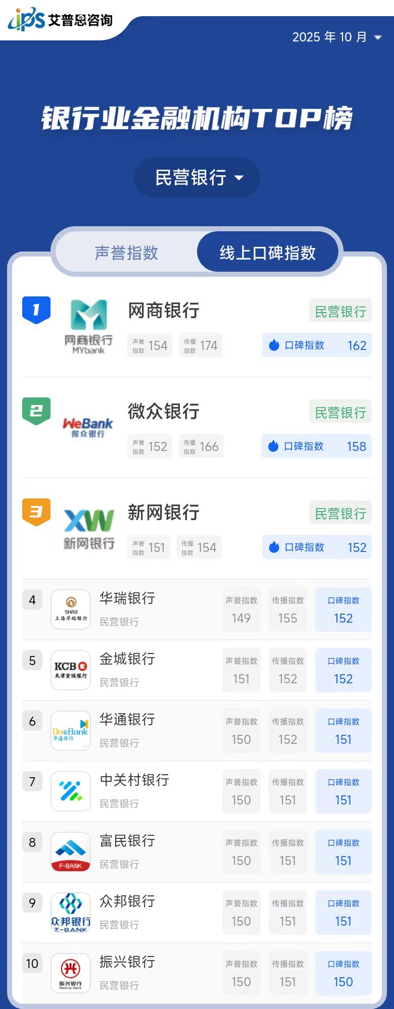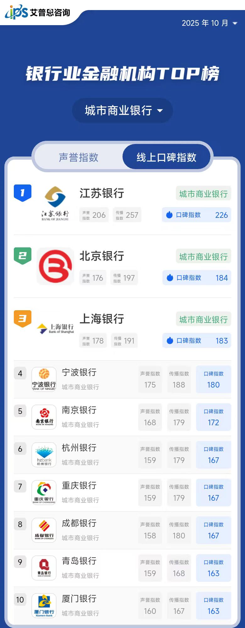 继《中国房地产品牌线上口碑指数排行榜》、《中国餐饮品牌线上口碑指数排行榜》之后,我们发布了原创指数“艾普思品牌线上口碑指数”的又一应用榜单——《中国银行业金融机构线上口碑指数排行榜》。近年来,我国银行机构业务量不断增长,因还款、服务、扣费等问题引发的消费纠纷屡见不鲜,随之产生的客户投诉、维权舆情、消极评论等通过网络大量传播,对机构的声誉和形象构成挑战。榜单旨在依托互联网文本大数据分析技术,助力银行机构在纷繁复杂的舆论环境中精准洞察自身线上口碑表现,从而提高声誉风险管理工作的有效性,增强抗风险能力,促进机构持续健康发展。