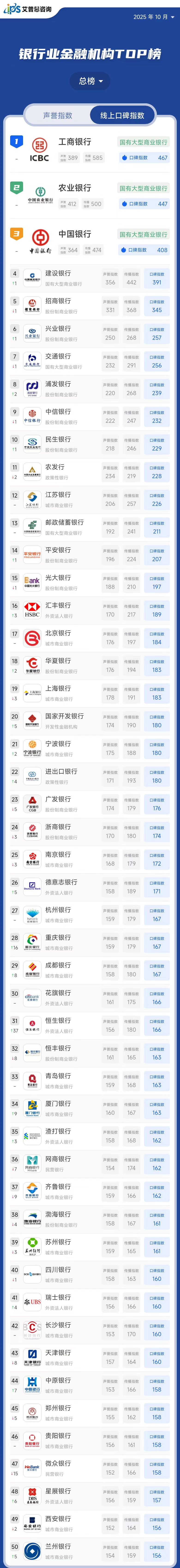10月线上口碑指数排名前三的银行业金融机构为:工商银行(国有大型商业银行,口碑指数467,排名与上月持平)、农业银行(国有大型商业银行,口碑指数447,排名与上月持平)、中国银行(国有大型商业银行,口碑指数408,排名与上月持平)。
