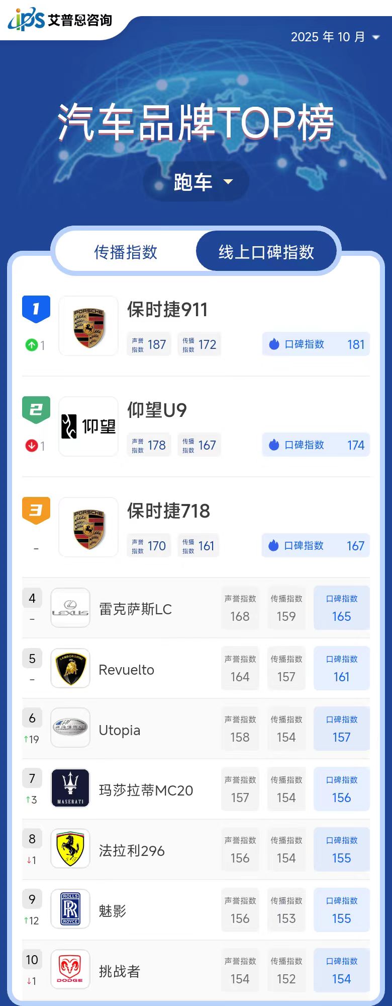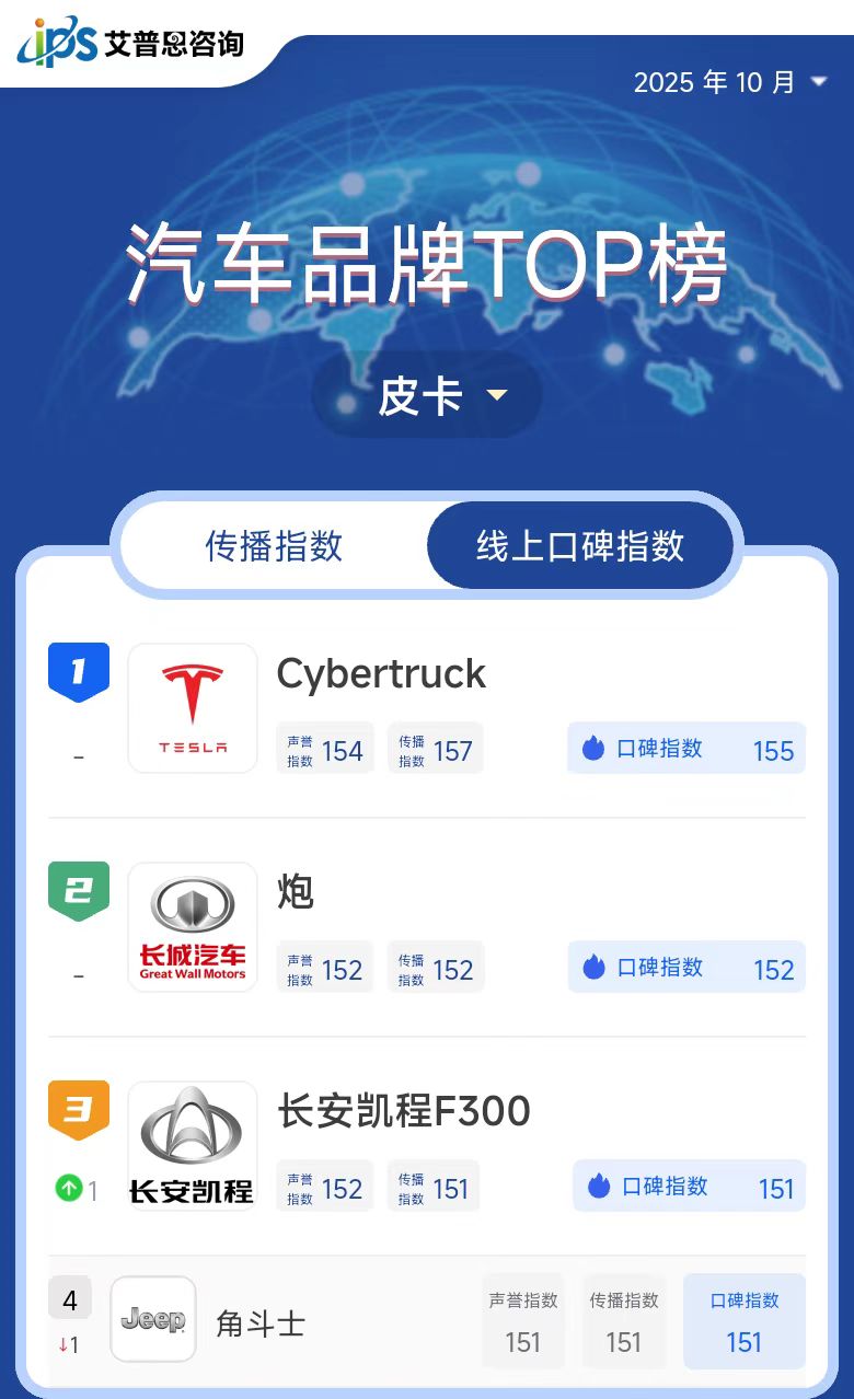 线上口碑指数排名前三的跑车车型为:保时捷911、仰望U9、保时捷718;线上口碑指数排名前三的皮卡车型为:Cybertruck、炮、长安凯程F300*。