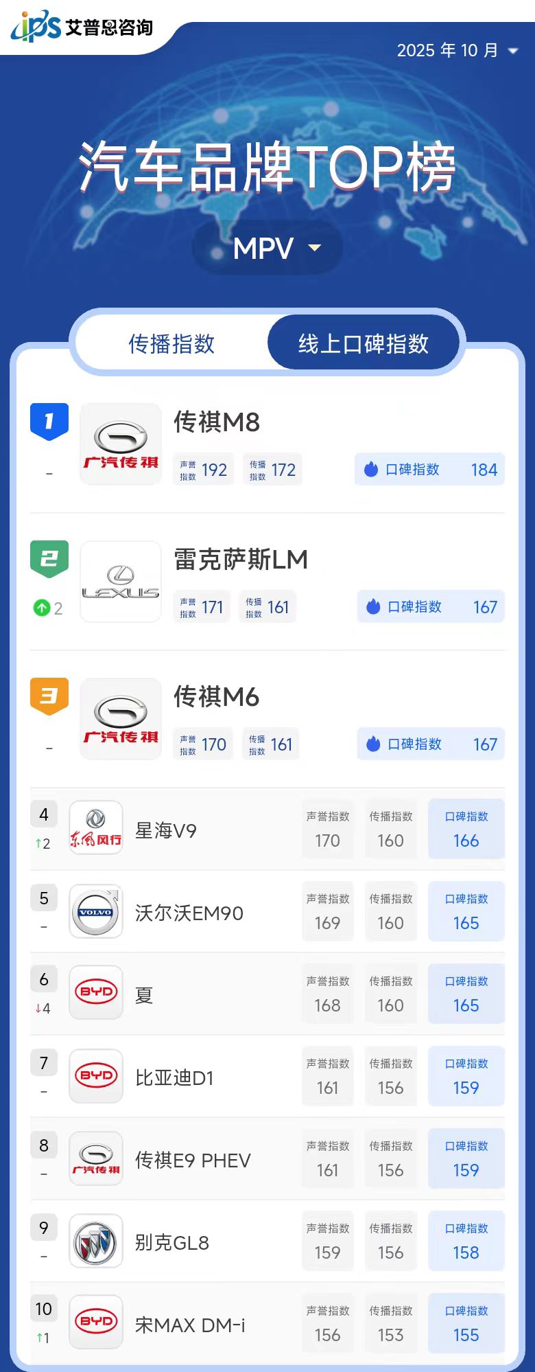 线上口碑指数排名前三的轿车车型为:尊界S800、阿维塔12*、享界S9T;线上口碑指数排名前三的SUV车型为:问界M9、问界M7、问界M8*;线上口碑指数排名前三的MPV车型为:传祺M8、雷克萨斯LM*、传祺M6;