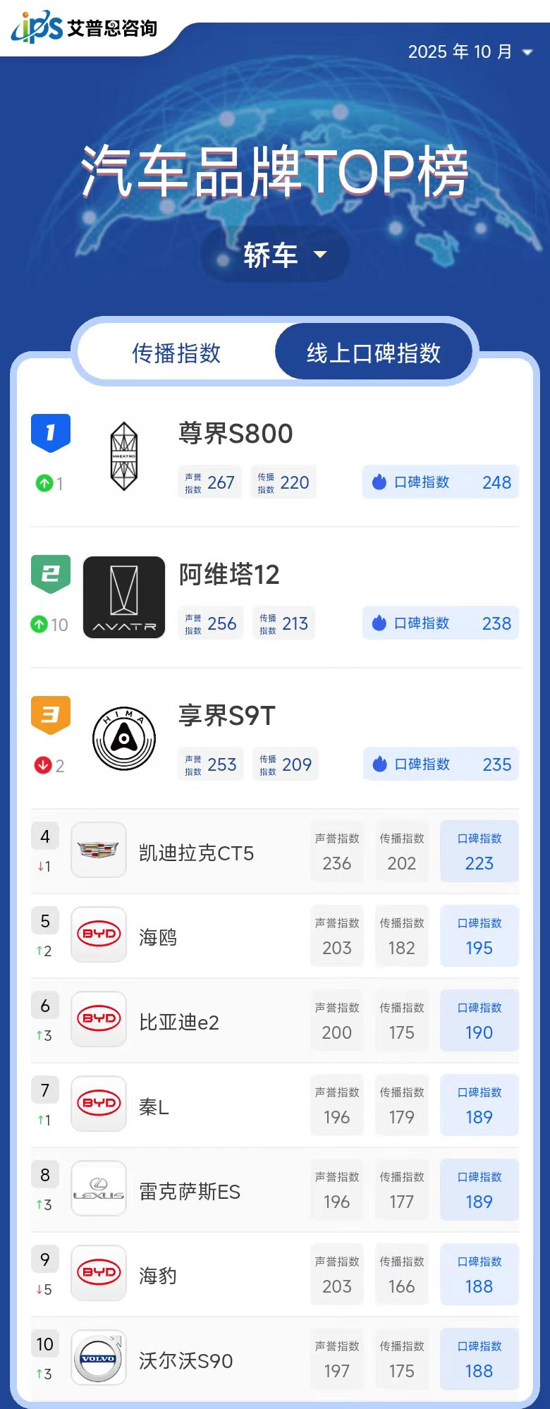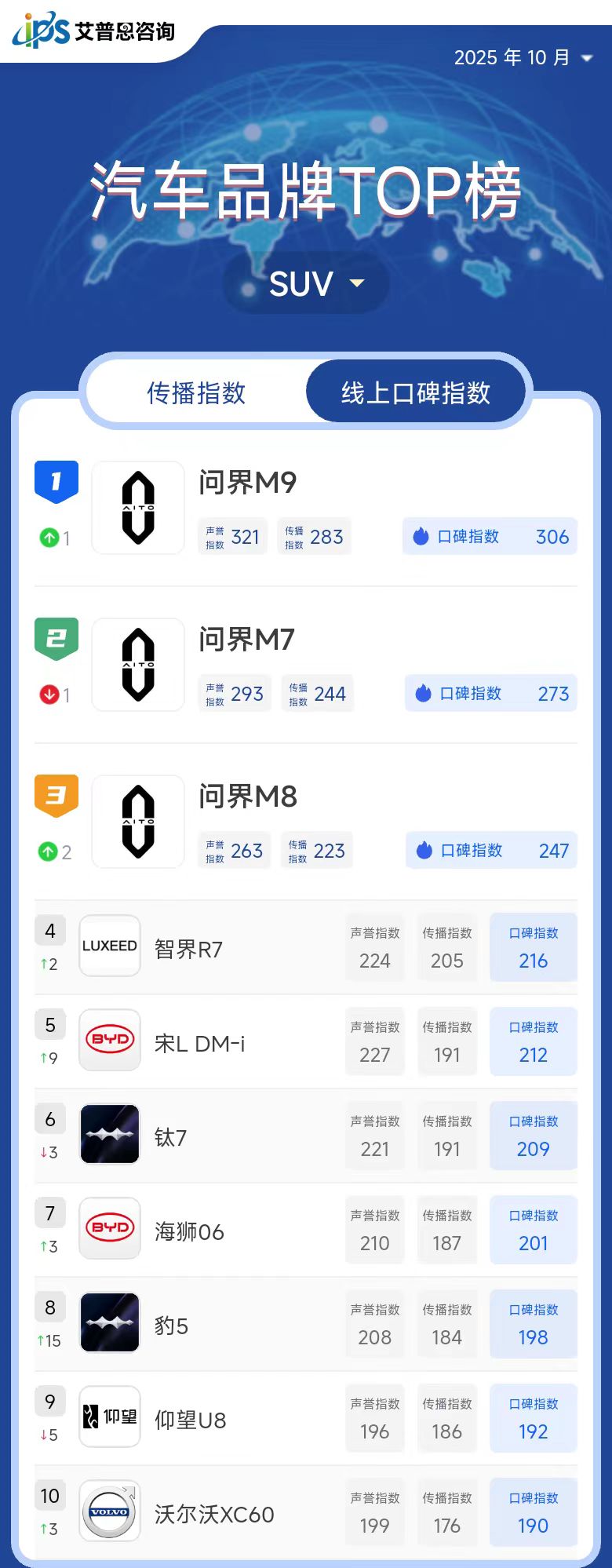 10月线上口碑指数排名前三的汽车车型为:问界M9(口碑指数306,排名较上月上升1位)、问界M7(口碑指数273,排名较上月下降1位)、尊界S800(口碑指数248,排名较上月上升4位)。