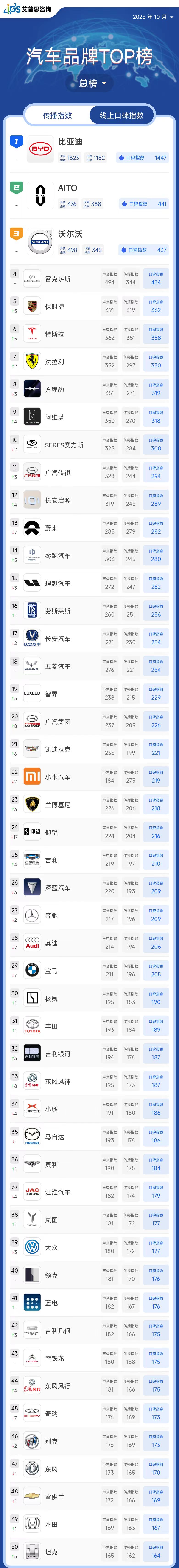 2025年10月线上口碑指数排名前三的汽车品牌为:比亚迪(口碑指数1447,排名与上月持平)、AITO(口碑指数441,排名与上月持平)、沃尔沃(口碑指数437,排名与上月持平);