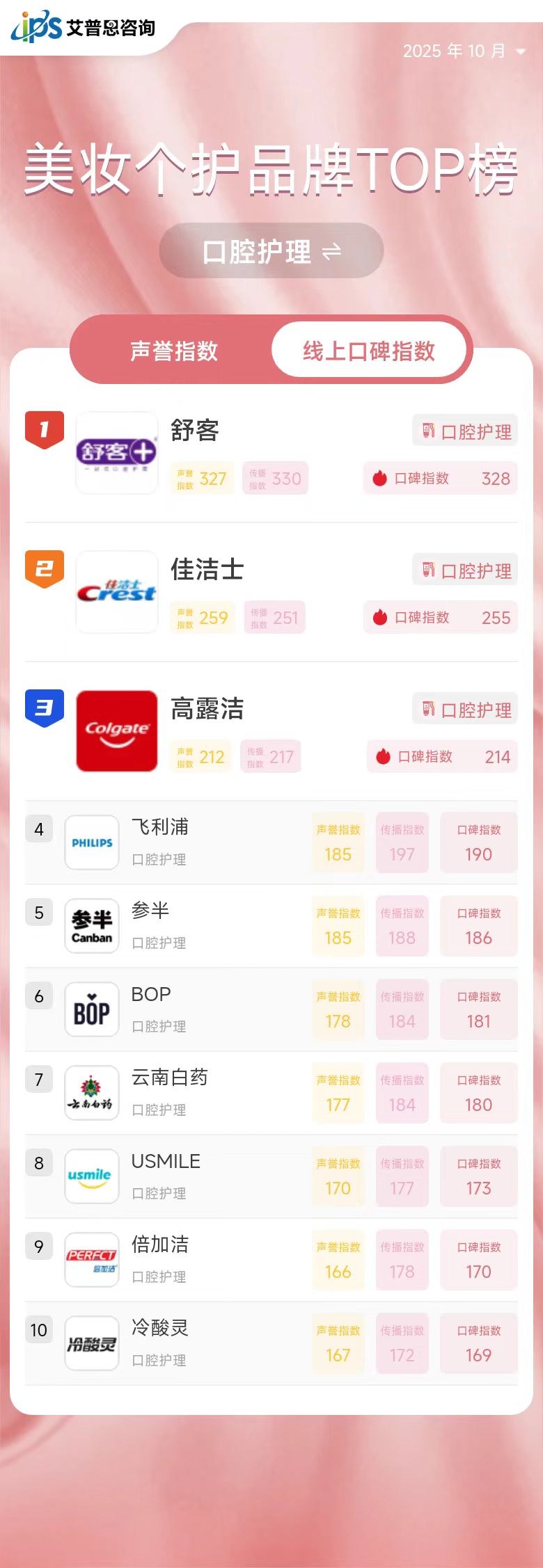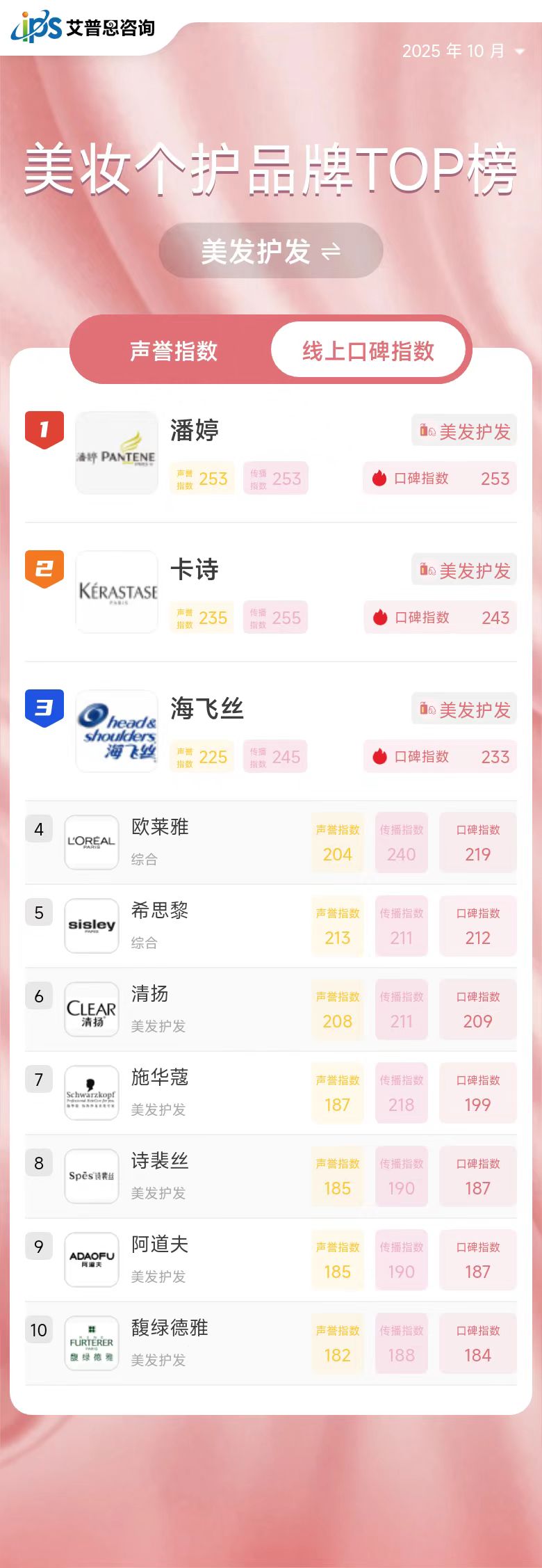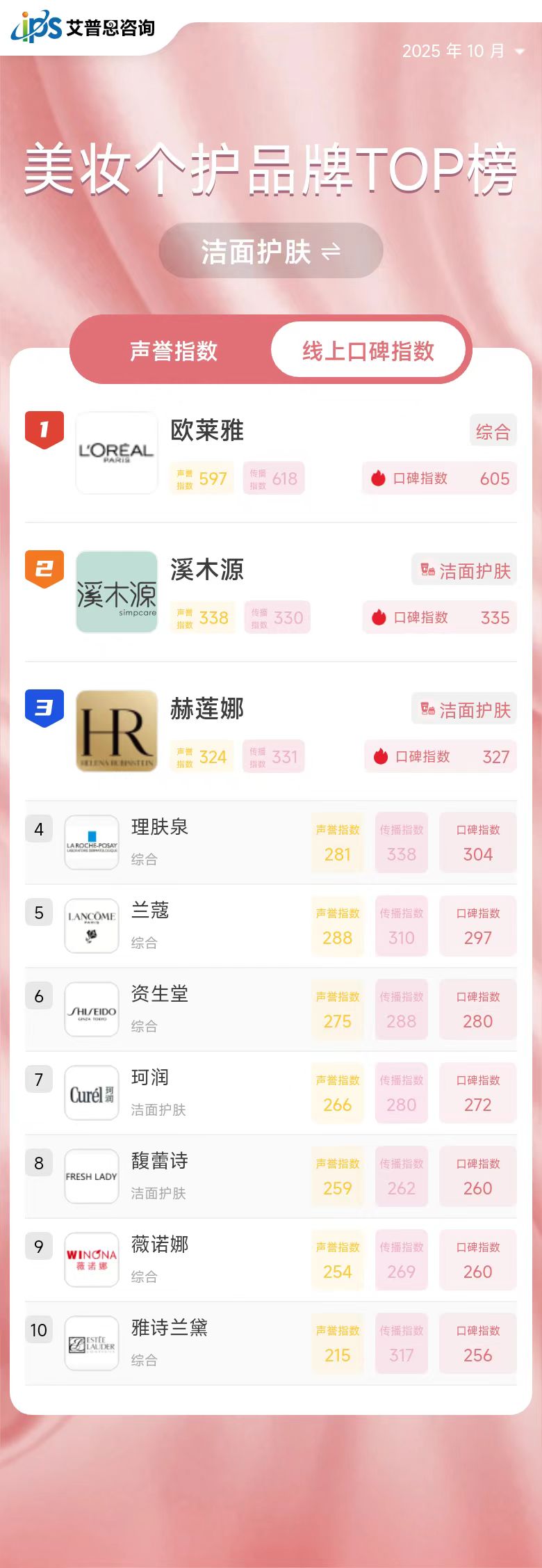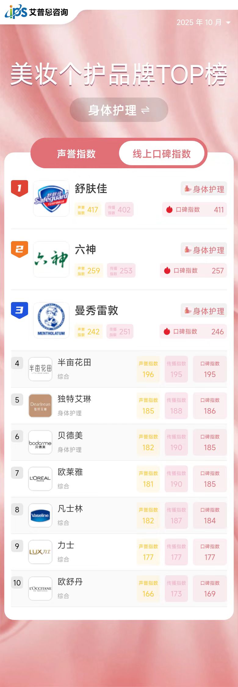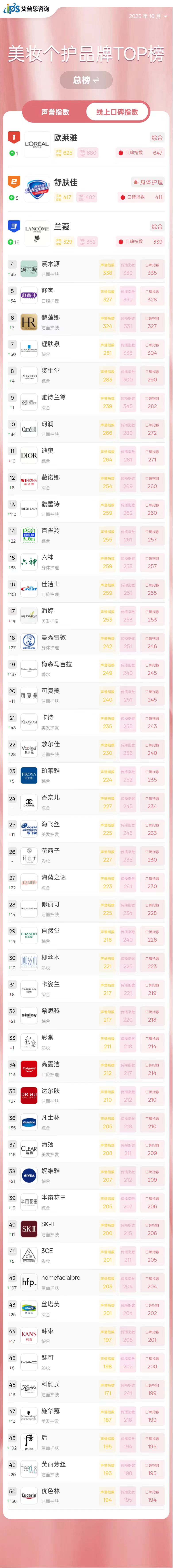 2025年10月线上口碑指数排名前三的美妆个护品牌为:欧莱雅(综合,口碑指数647,排名较上月上升1位)、舒肤佳(身体护理,口碑指数411,排名较上月上升3位)、兰蔻(综合,口碑指数339,排名较上月上升16位)。