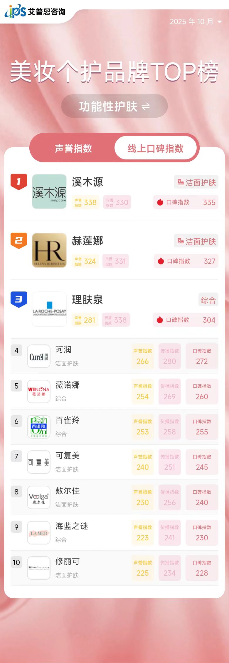 线上口碑指数排名前三的功能性护肤品牌为:溪木源*、赫莲娜、理肤泉*。