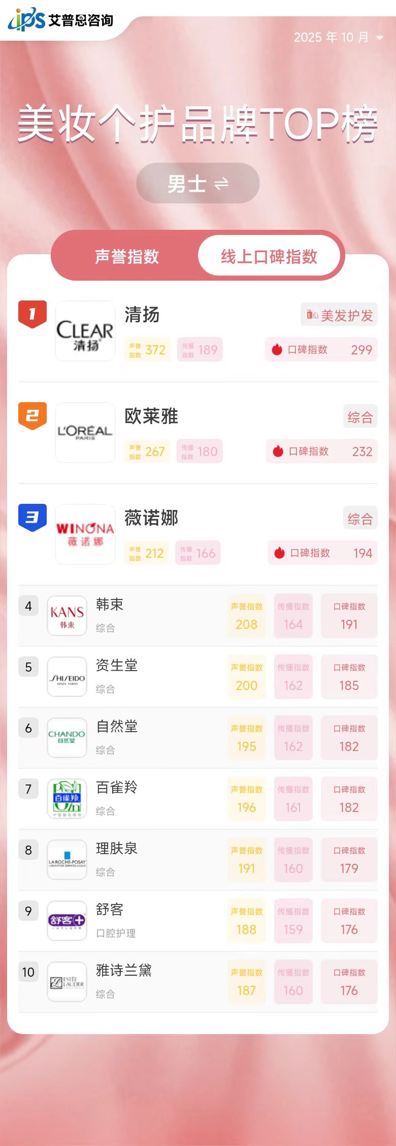线上口碑指数排名前三的男士美妆个护品牌为:清扬、欧莱雅、薇诺娜*。