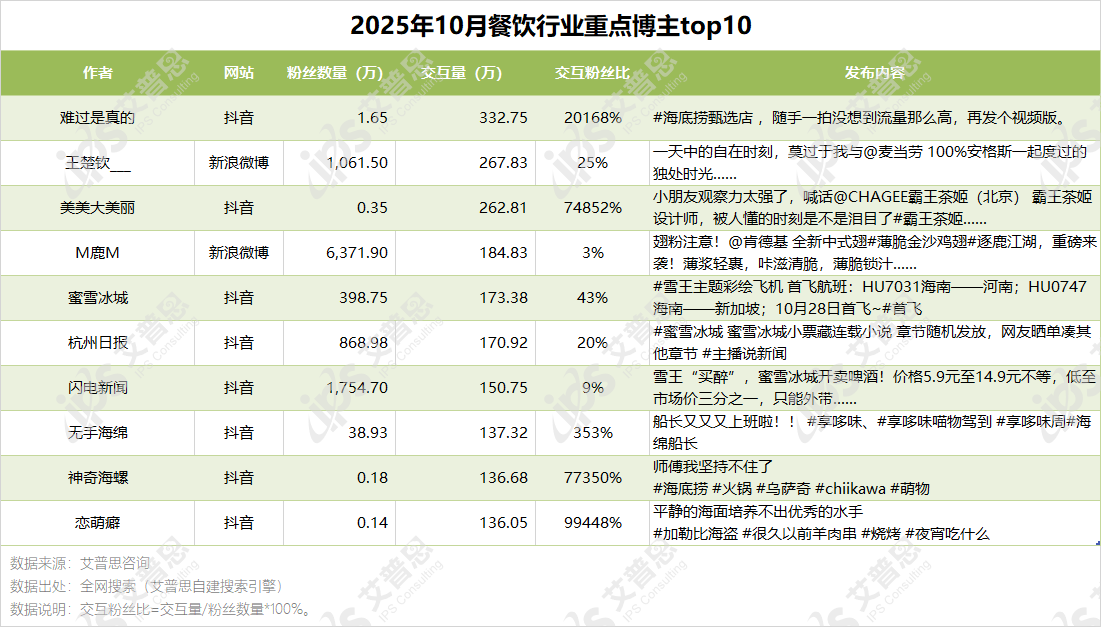2025年10月,难过是真的、王楚钦___、美美大美丽等博主获得交互量较高,恋萌癖、神奇海螺、美美大美丽等博主交互粉丝比较高。从发布内容来看,代言人发布的宣传视频及海底捞甄选店探店视频最受欢迎。