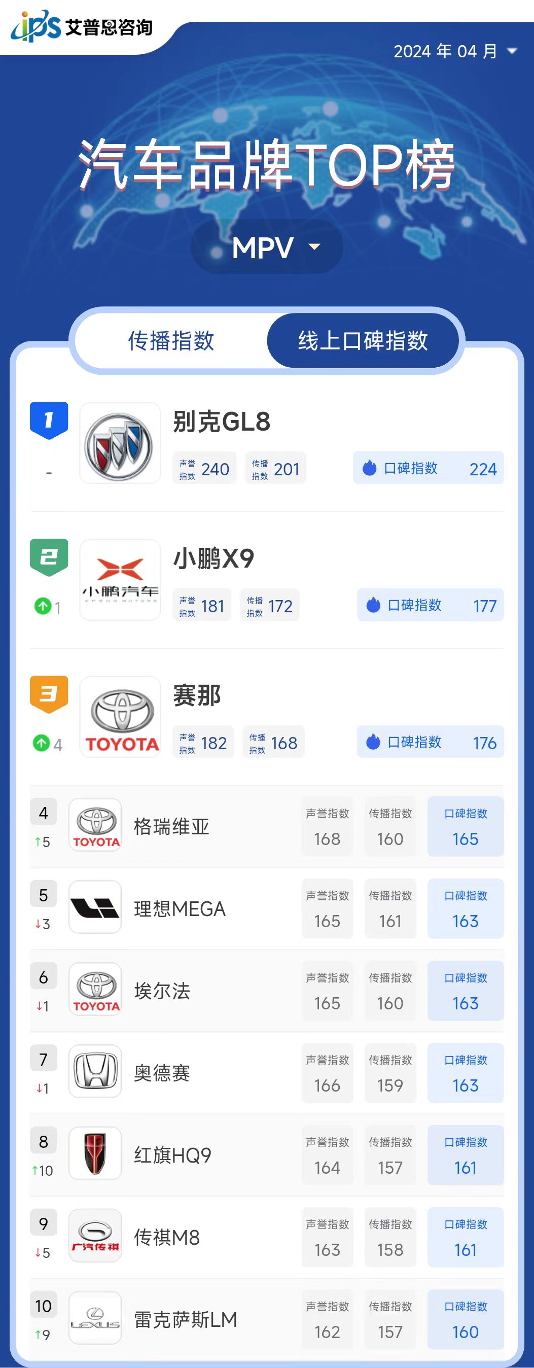 线上口碑指数排名前三的轿车车型为:小米SU7、纳米01*、迈腾*;线上口碑指数排名前三的SUV车型为:仰望U8、腾势N7*、揽胜;线上口碑指数排名前三的MPV车型为:别克GL8、小鹏X9、赛那*;
