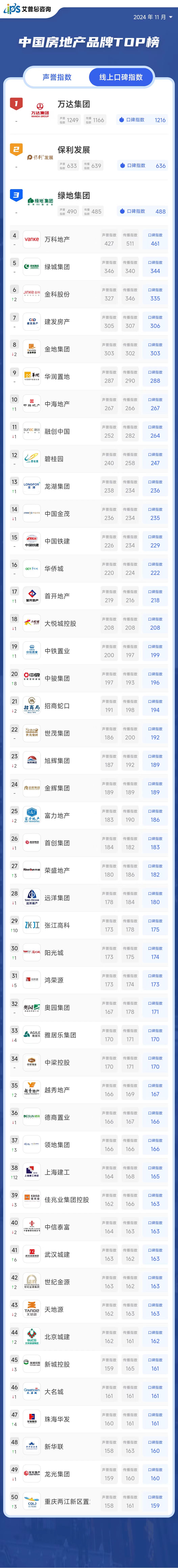 11月线上口碑指数位列前三的房地产品牌为:万达集团(口碑指数1216,排名与上月持平)、保利发展(口碑指数636,排名与上月持平)、绿地集团(口碑指数488,排名与上月持平)。万达集团品牌传播优势和声誉表现持续向好,传播指数、声誉指数及综合口碑指数均位列第1。