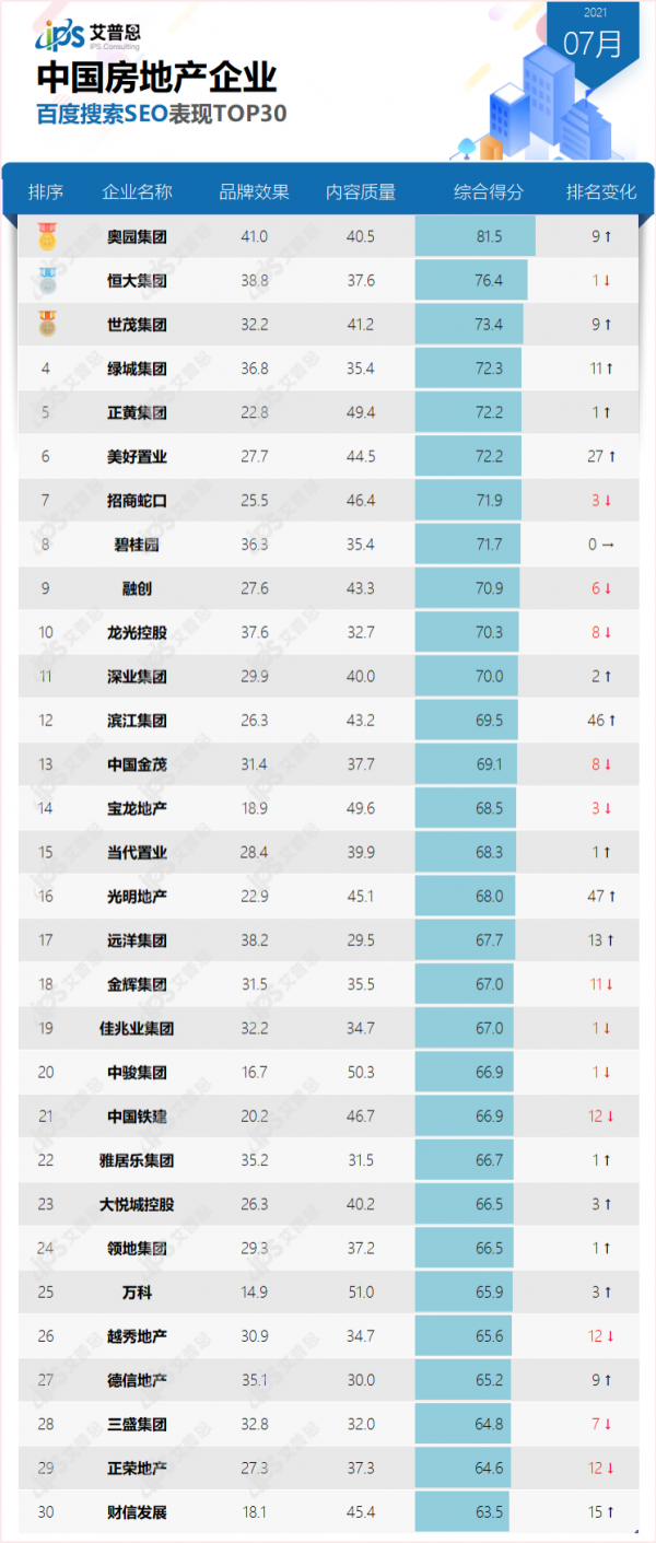 本期(2021年7月)百度搜索SEO表现位列前三甲的房地产企业为:奥园集团(81.5分)、恒大集团(76.4分)、世茂集团(73.4分)。其它入围前30名的房地产企业还有:正黄集团、碧桂园、招商蛇口、领地集团等。