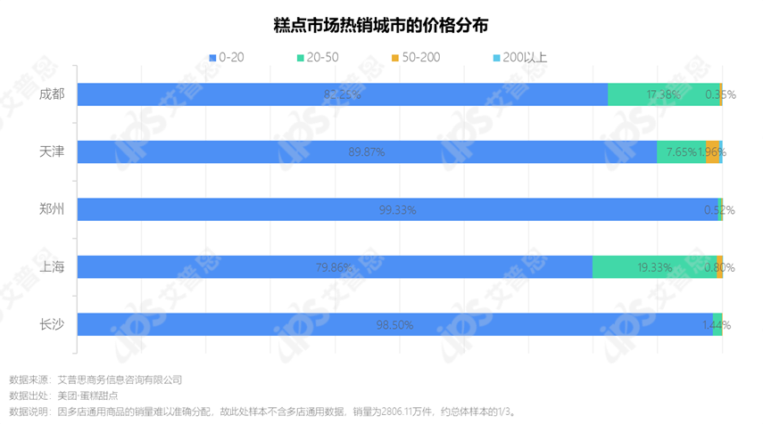 糕点细分市场中,成都和上海的消费者更能接受价格相对较高的产品,20-50元的产品销量占比均超高15%。