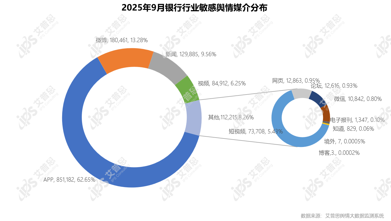 9月,银行业敏感舆情声量来源中,占比最高的媒介为APP,达62.65%,舆情声量为851,182篇次;其次为微博,舆情声量达180,461篇次,占比13.28%;排名第三的为新闻,舆情声量为129,885篇次,占比9.56%;第四为视频,舆情声量为84,912篇次,占比6.25%;其他媒介中,短视频、网页、论坛等媒介的总占比达8.26%,舆情声量为112,215 篇次。