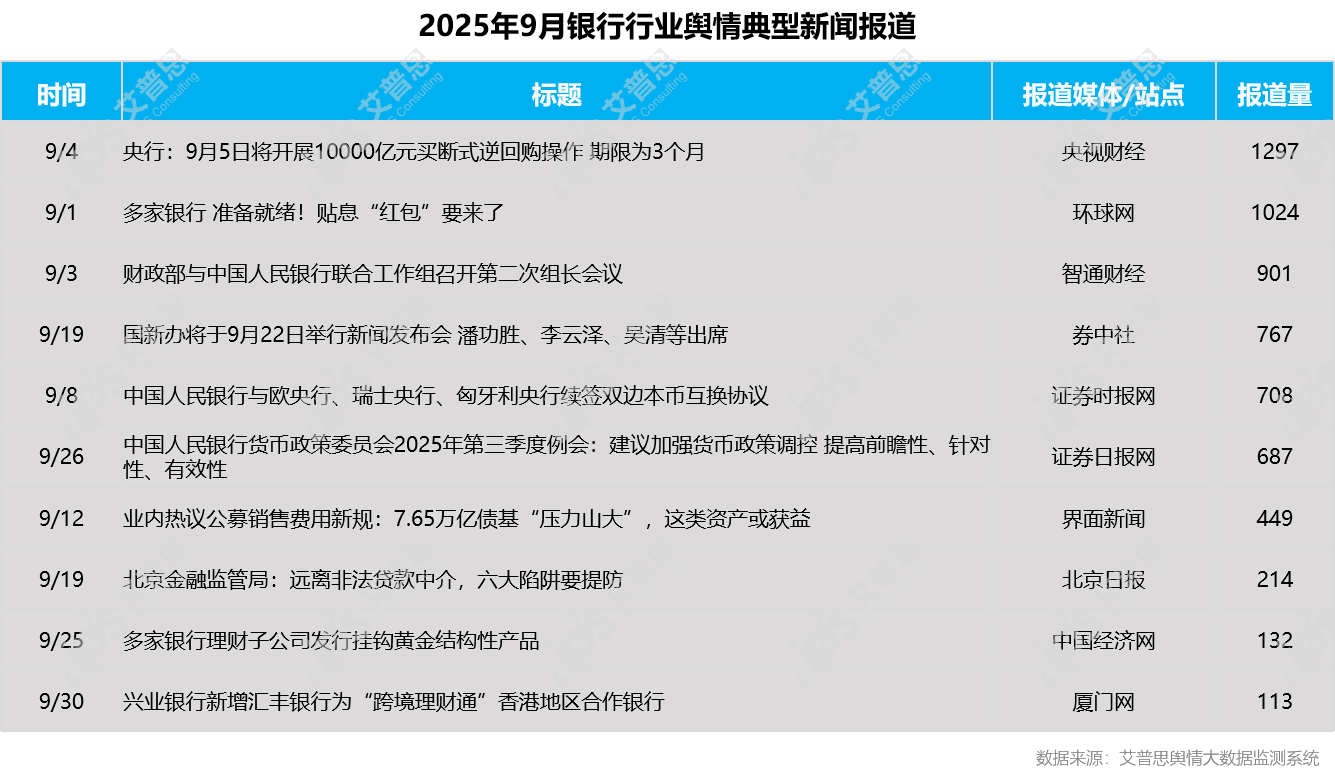 本报告基于2025年9月银行业线上公开舆情数据,从行业发展状况、舆情态势、机构/品牌舆情表现、重点舆情话题及事件等维度,对本月银行业网络舆情进行追踪和解读,以期为银行机构声誉风险管理提供参考。