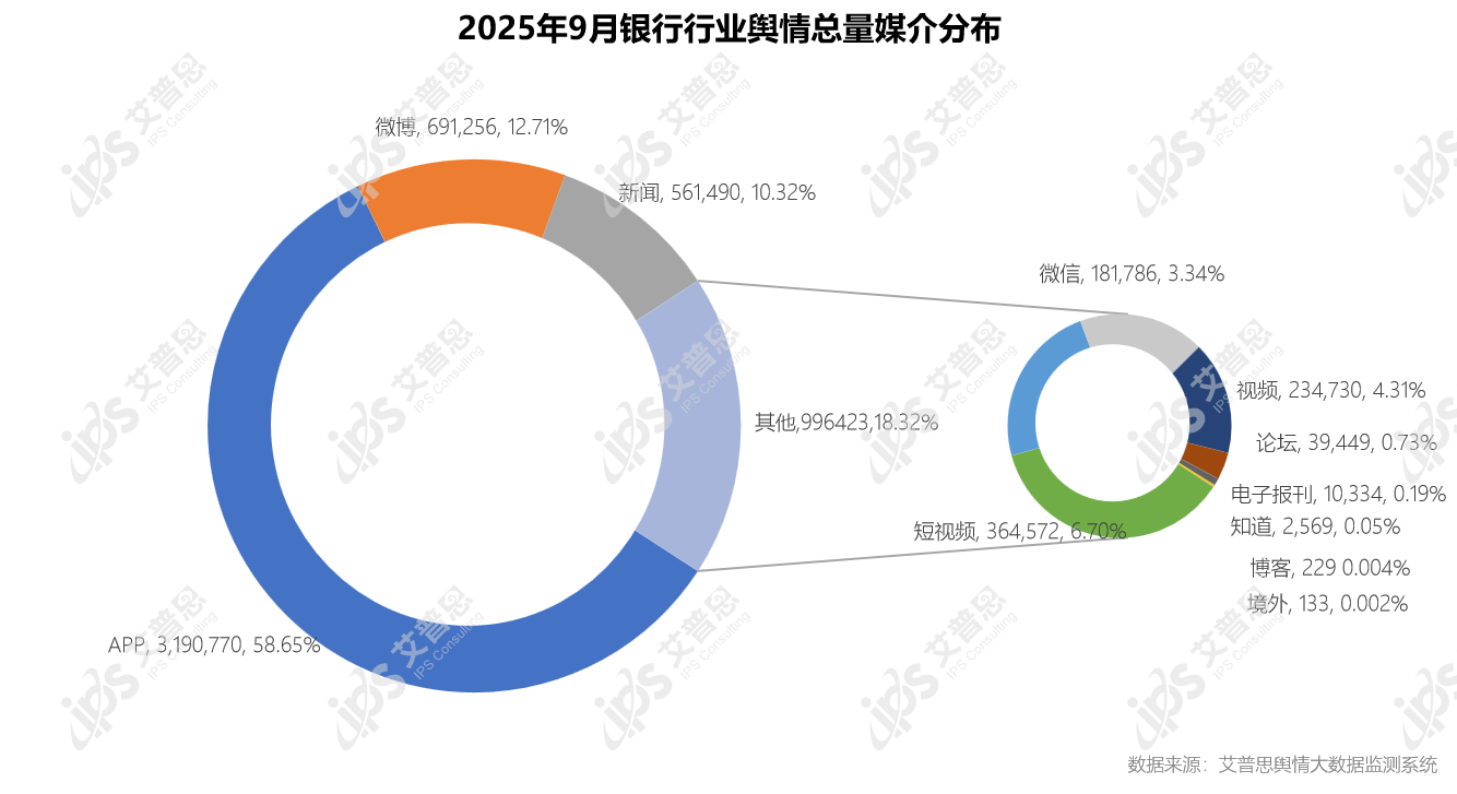 9月,银行业舆情声量来源中,占比最高的媒介为APP,达58.65%,舆情声量为3,190,770篇次;其次为微博,舆情声量达691,256篇次,占比12.71%;排名第三的是新闻,舆情声量达561,490篇次,占比10.32%;其他媒介中,短视频、微信、网页等媒介的总占比达18.32%,舆情声量为996,423 篇次。