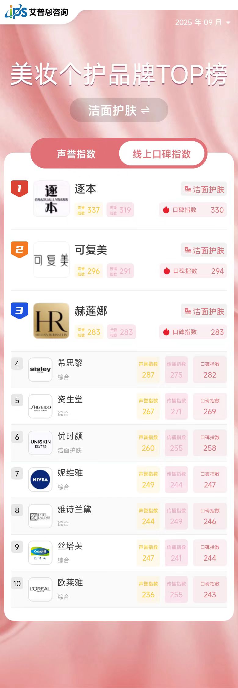 线上口碑指数排名前三的功能性护肤品牌为:逐本*、可复美*、赫莲娜*。