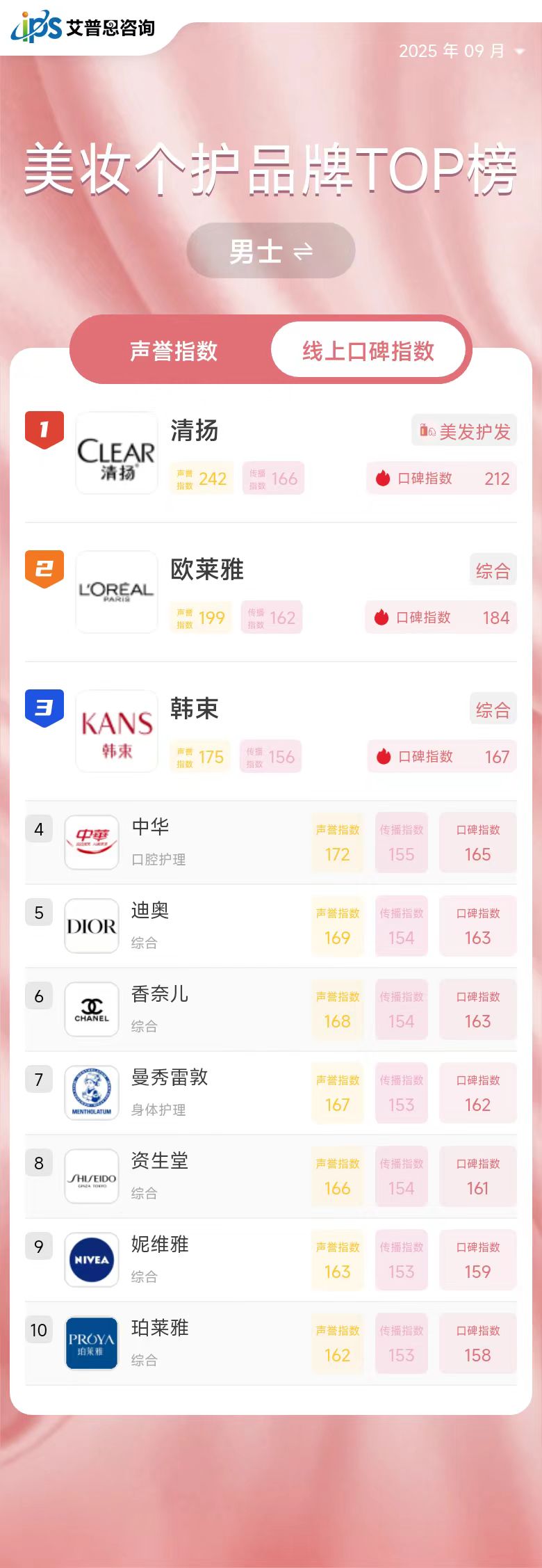 线上口碑指数排名前三的男士美妆个护品牌为:清扬、欧莱雅*、韩束*。
