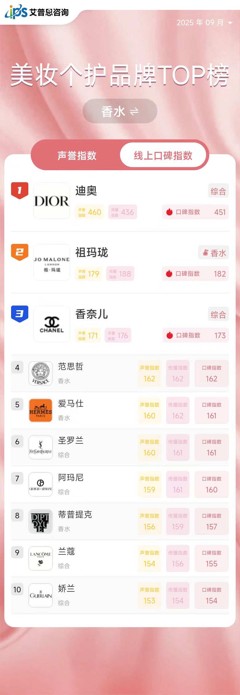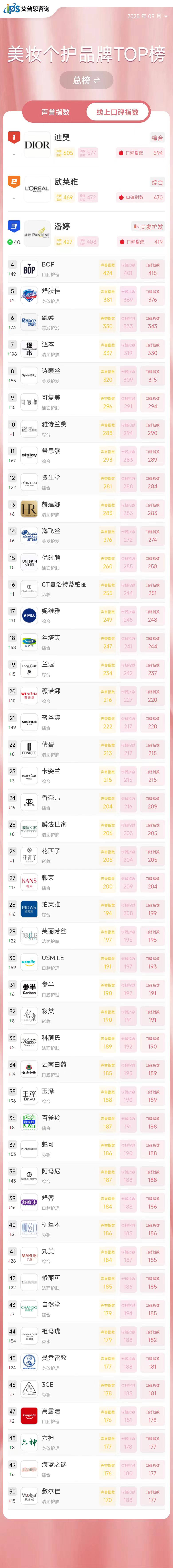 2025年9月线上口碑指数排名前三的美妆个护品牌为:迪奥(综合,口碑指数594,排名与上月持平)、欧莱雅(综合,口碑指数470,排名与上月持平)、潘婷(美发护发,口碑指数419,排名较上月上升40位)。