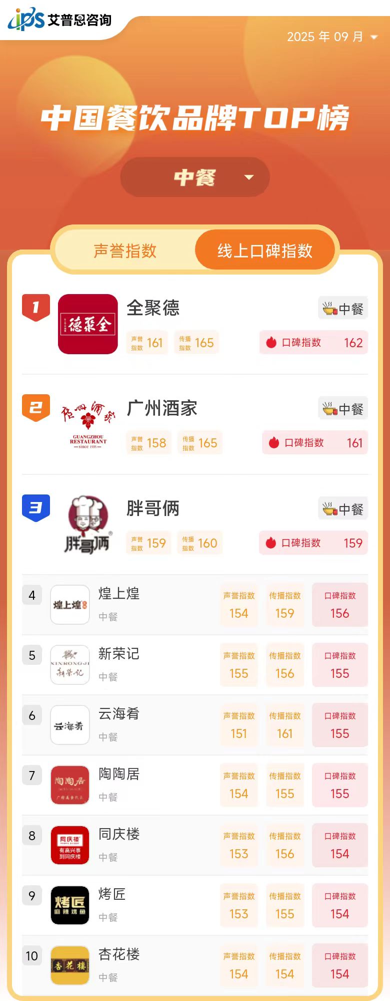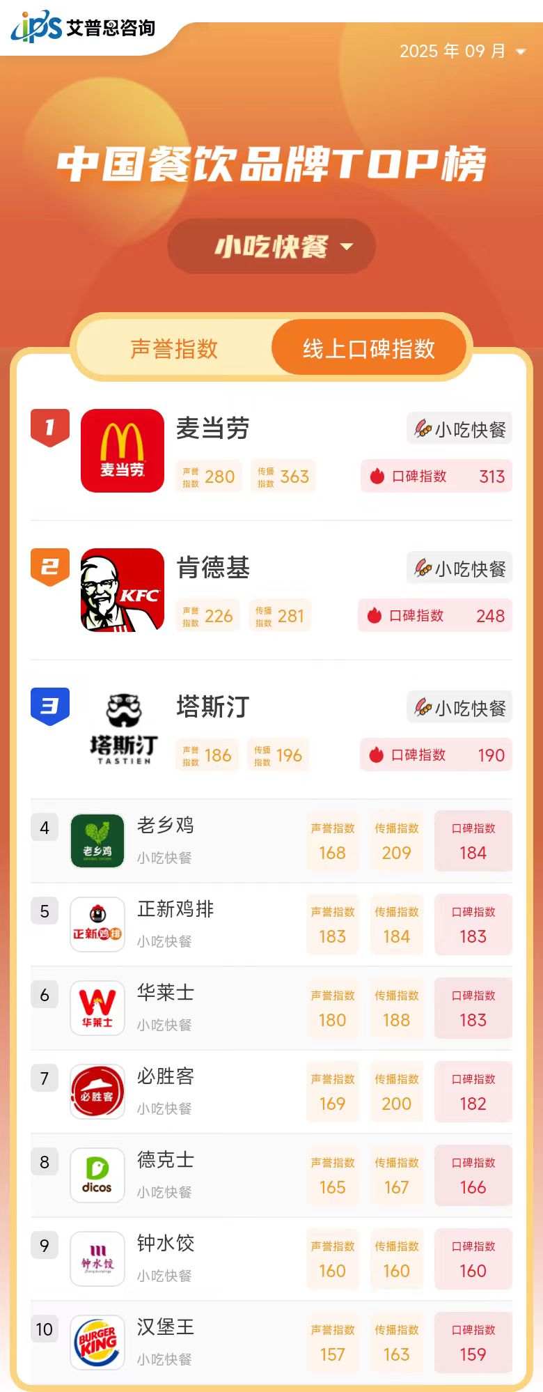 继《中国房地产品牌线上口碑指数排行榜》之后,我们发布了原创指数“艾普思品牌线上口碑指数”的又一应用榜单——《中国餐饮品牌线上口碑指数排行榜》。国家统计局发布的数据显示,2024年全年,全国餐饮收入55718亿元,同比增长5.3%,餐饮消费潜力持续恢复。与此同时,据红餐网数据显示,2024年有近300万家餐饮门店关闭,创下历史新高。行业整体收入实现增长,门店关闭的态势却不断加剧,反映出当下餐饮市场竞争已经进入白热化阶段。榜单旨在依托互联网文本大数据分析技术,助力餐饮企业在后疫情时代精准洞察品牌线上口碑表现,加强消费者聆听,有针对性地实施产品及品牌策略,增强抗风险能力,促进品牌持续健康发展。