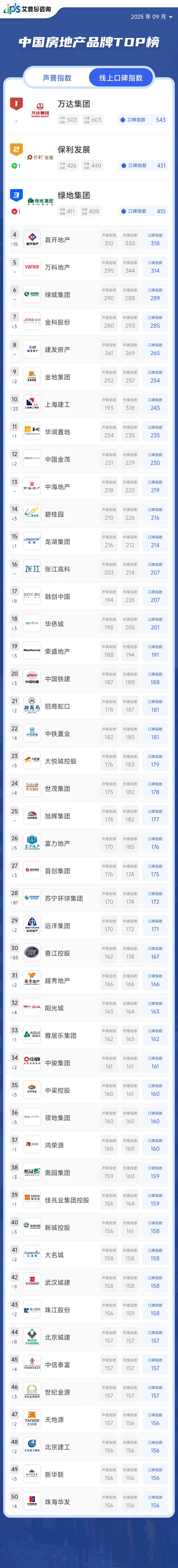 2025年9月线上口碑指数位列前三的房地产品牌为:万达集团(口碑指数543,排名与上月持平)、保利发展(口碑指数431,排名较上月上升1位)、绿地集团(口碑指数410,排名较上月下降1位)。