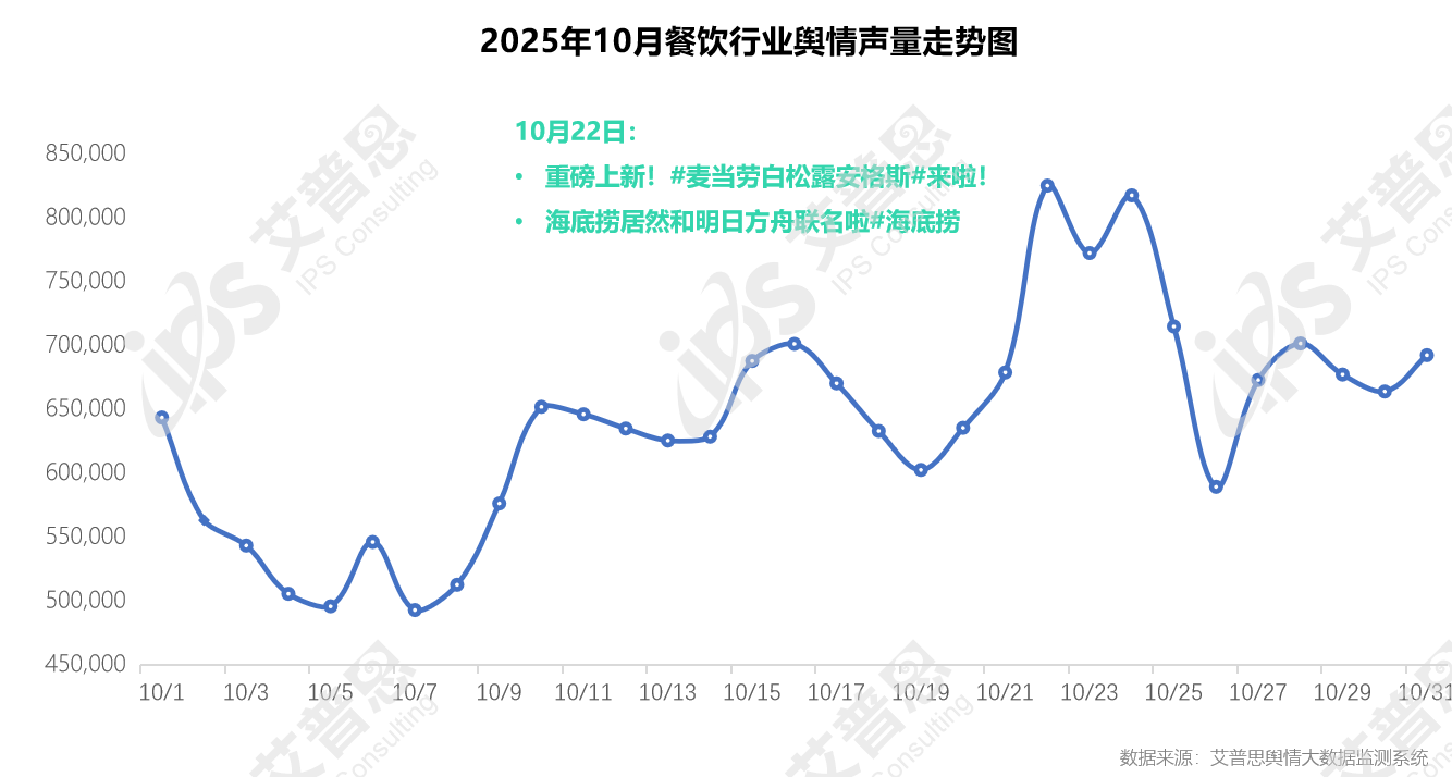 从声量走势来看,声量高峰期在10月22日,主要由“重磅上新!#麦当劳白松露安格斯#来啦!”和“海底捞居然和明日方舟联名啦#海底捞”相关宣传带动声量。