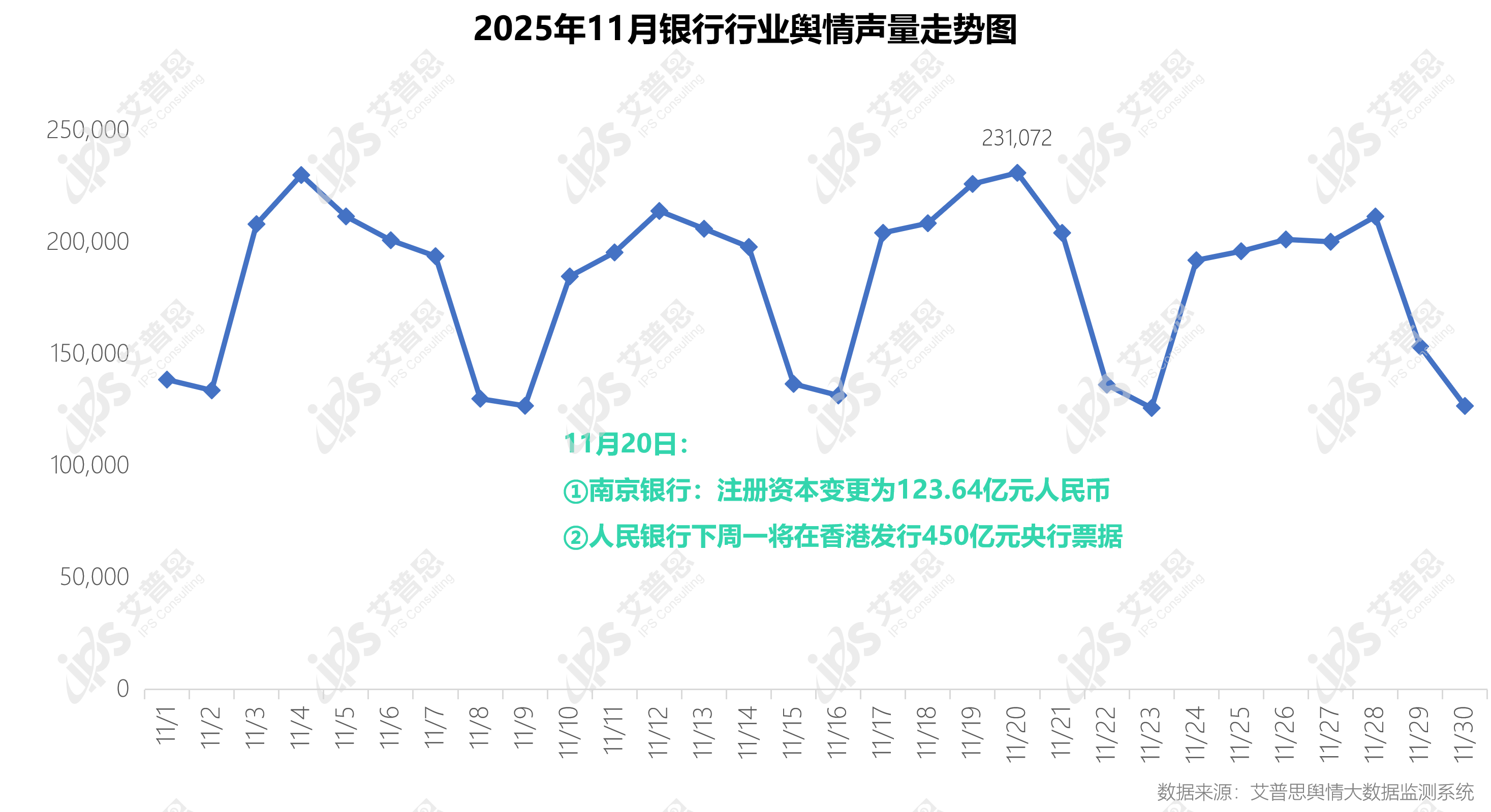 本报告基于2025年11月银行业线上公开舆情数据,从行业发展状况、舆情态势、机构/品牌舆情表现、重点舆情话题及事件等维度,对本月银行业网络舆情进行追踪和解读,以期为银行机构声誉风险管理提供参考。