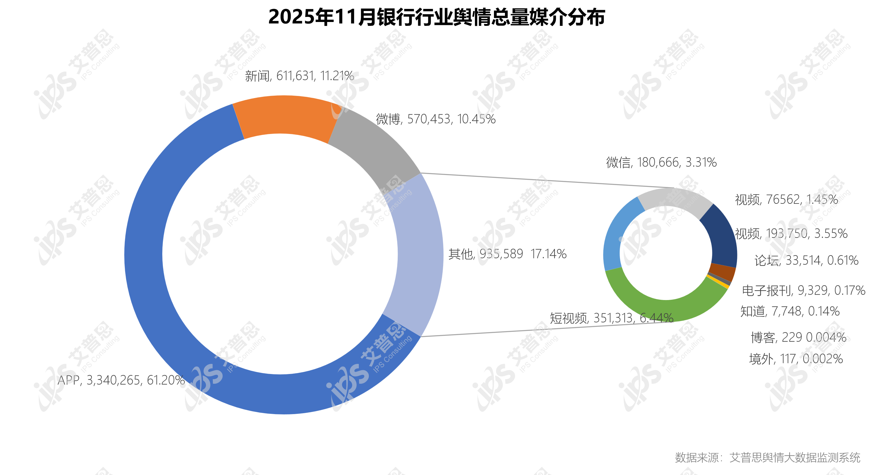 11月,银行业舆情声量来源中,占比最高的媒介为APP,达61.20%,舆情声量为3,340,265篇次;其次为新闻,舆情声量达611,631篇次,占比11.21%;排名第三的是微博,舆情声量达570,453篇次,占比10.45%;其他媒介中,短视频、微信、网页等媒介的总占比达17.14%,舆情声量为935,589篇次。