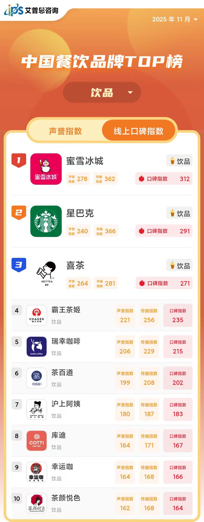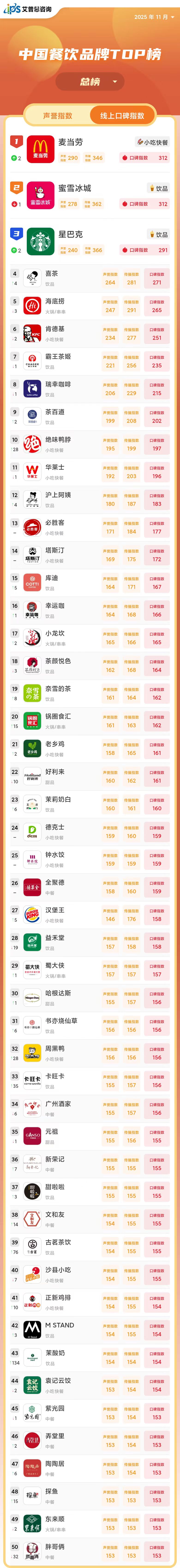 11月线上口碑指数排名前三的餐饮品牌为:麦当劳(小吃/快餐,口碑指数312)、蜜雪冰城(饮品,口碑指数312)、星巴克(饮品,口碑指数291)。