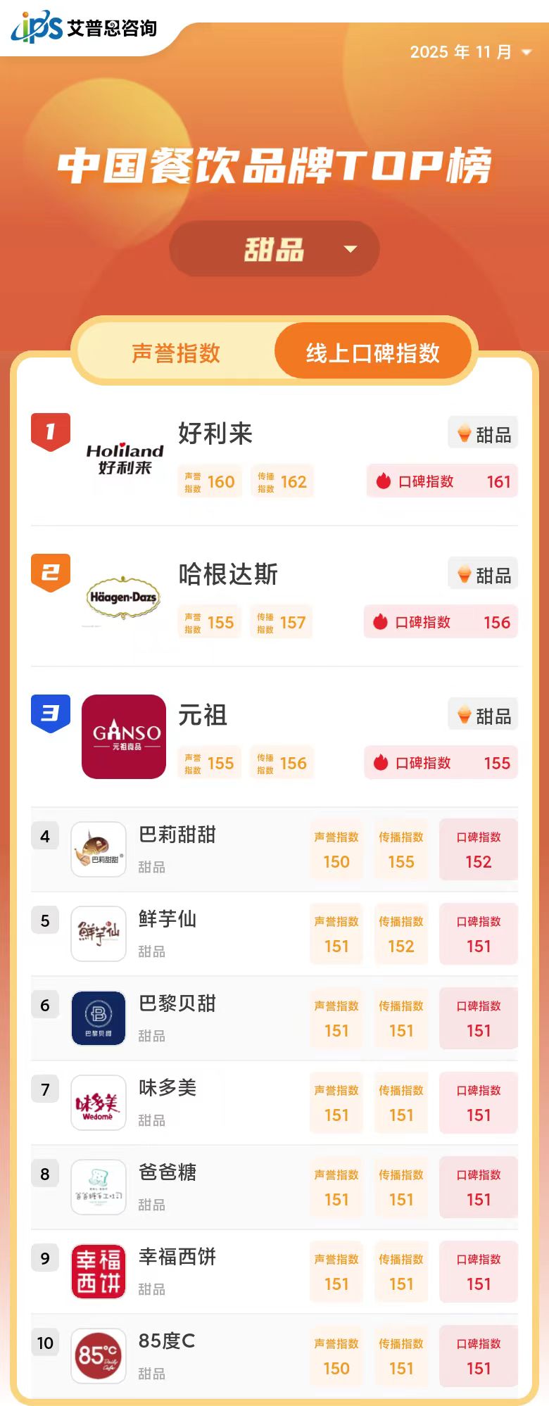 线上口碑指数排名前三的甜品品牌为:好利来、哈根达斯、元祖;线上口碑指数排名前三的饮品品牌为:蜜雪冰城、星巴克、喜茶*;线上口碑指数排名前三的日韩料理品牌为汉拿山、N多寿司*、大渔铁板烧;线上口碑指数排名前三的西餐品牌为牛约堡、gaga*、王品牛排*。