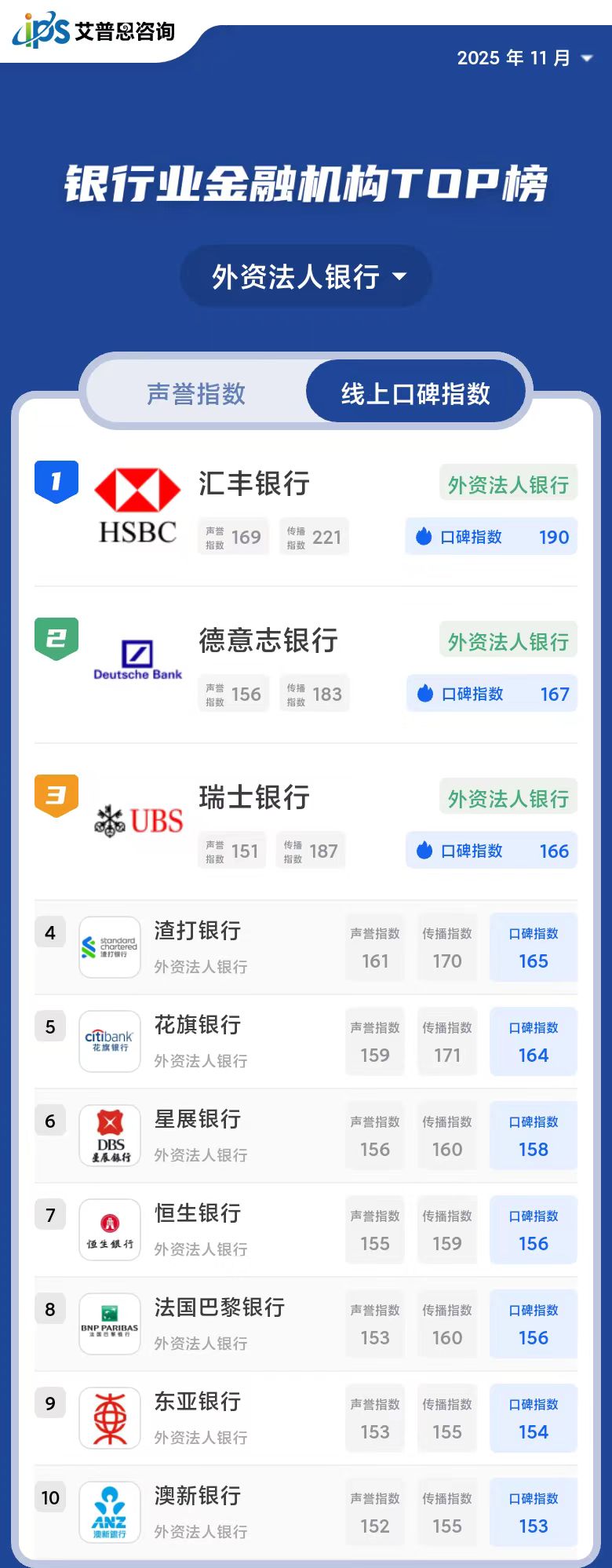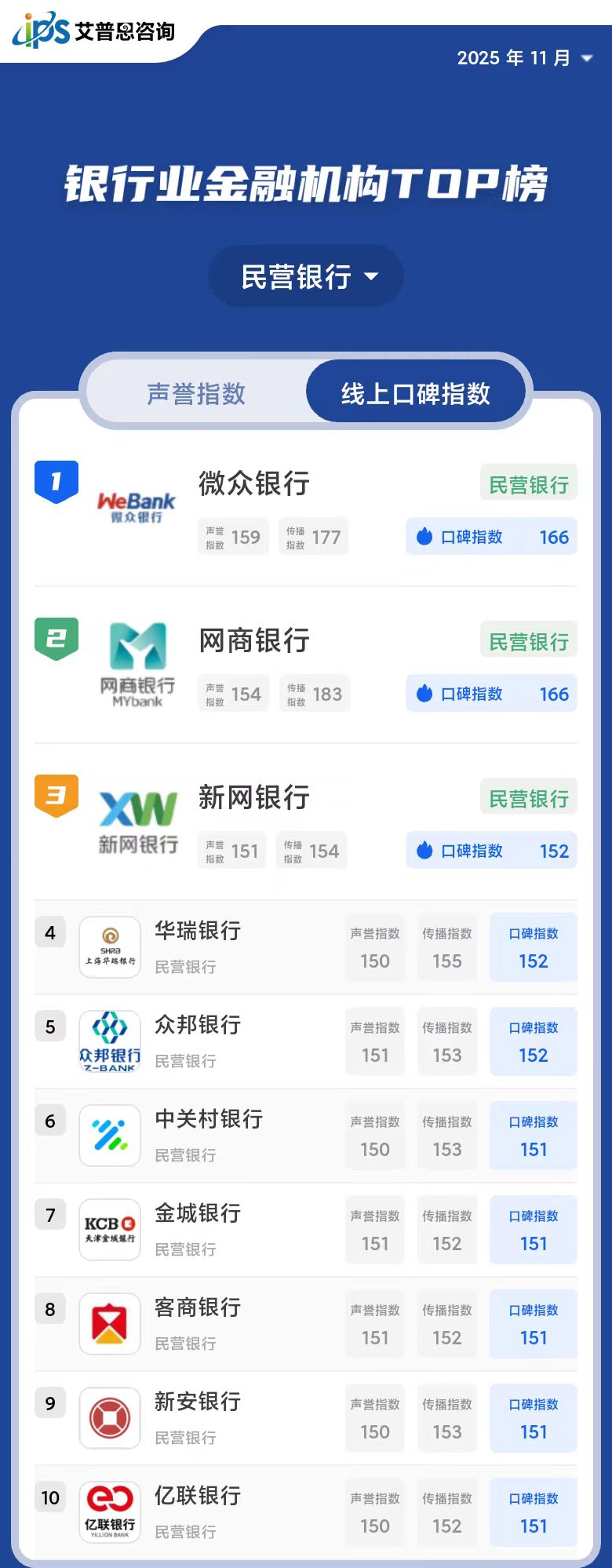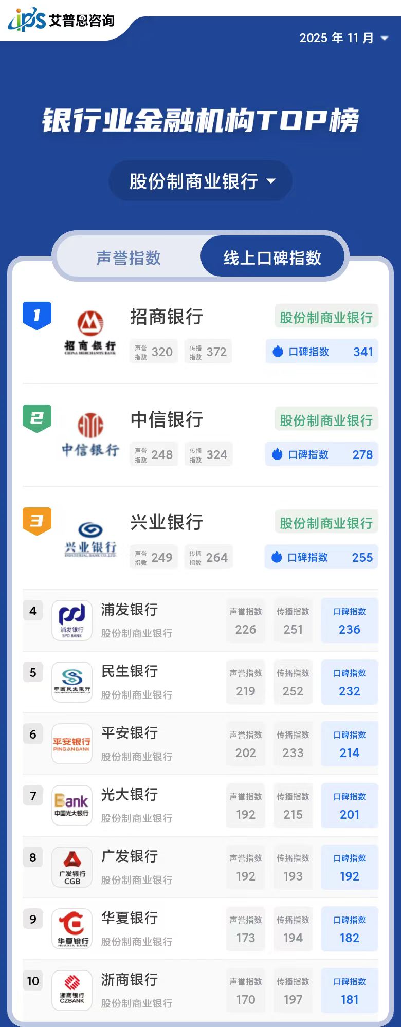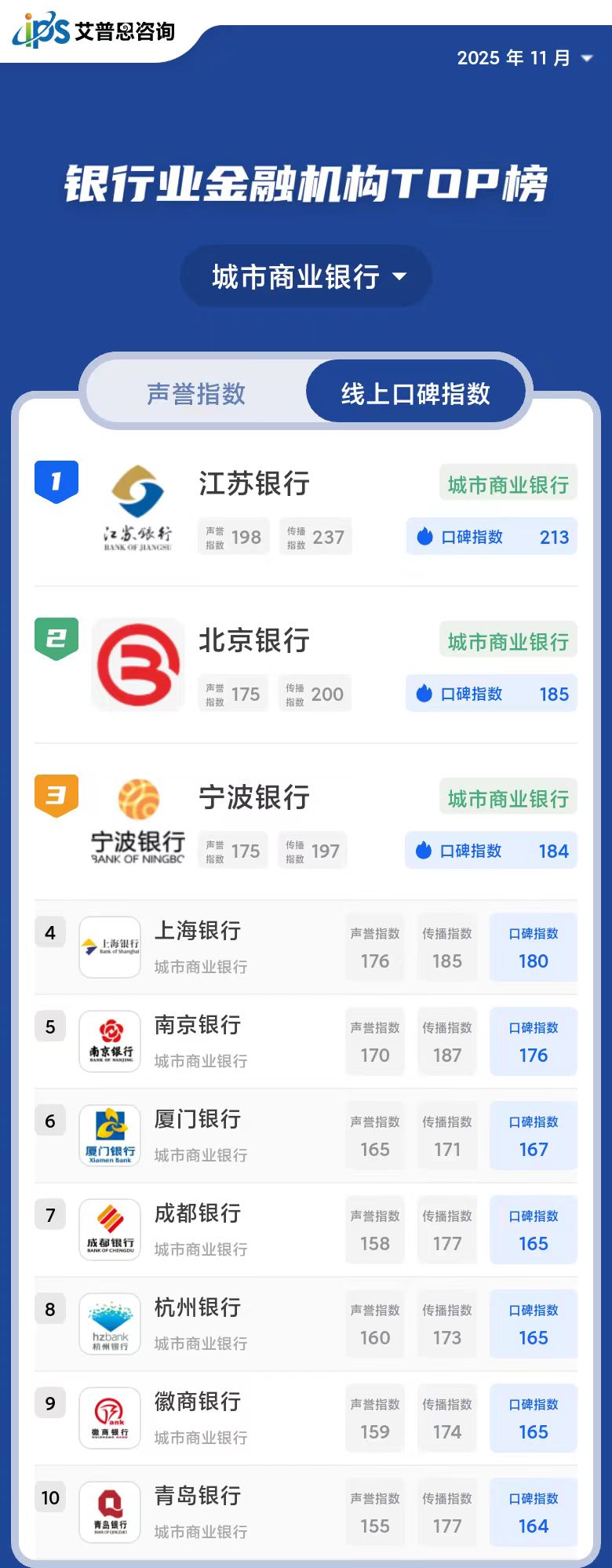 继《中国房地产品牌线上口碑指数排行榜》、《中国餐饮品牌线上口碑指数排行榜》之后,我们发布了原创指数“艾普思品牌线上口碑指数”的又一应用榜单——《中国银行业金融机构线上口碑指数排行榜》。近年来,我国银行机构业务量不断增长,因还款、服务、扣费等问题引发的消费纠纷屡见不鲜,随之产生的客户投诉、维权舆情、消极评论等通过网络大量传播,对机构的声誉和形象构成挑战。榜单旨在依托互联网文本大数据分析技术,助力银行机构在纷繁复杂的舆论环境中精准洞察自身线上口碑表现,从而提高声誉风险管理工作的有效性,增强抗风险能力,促进机构持续健康发展。