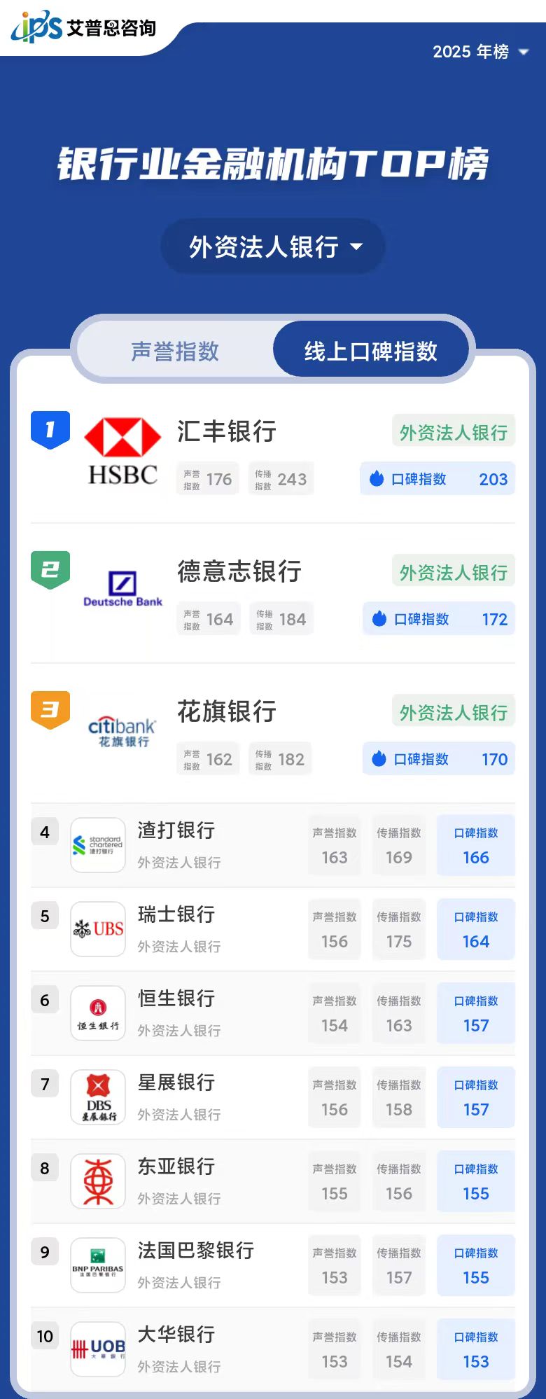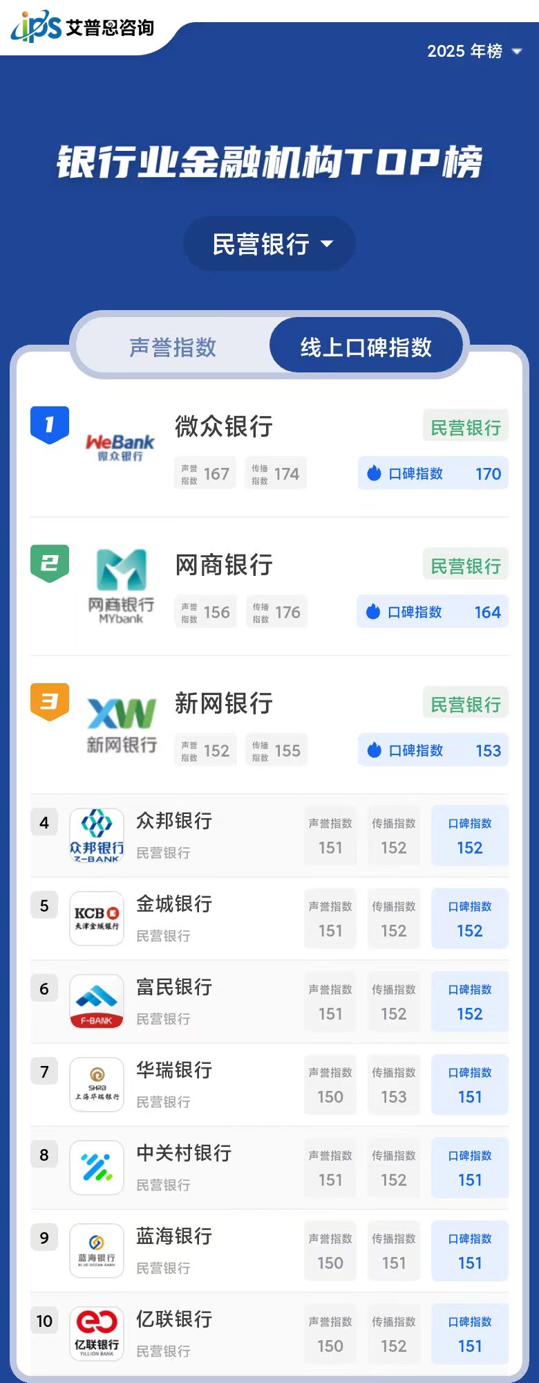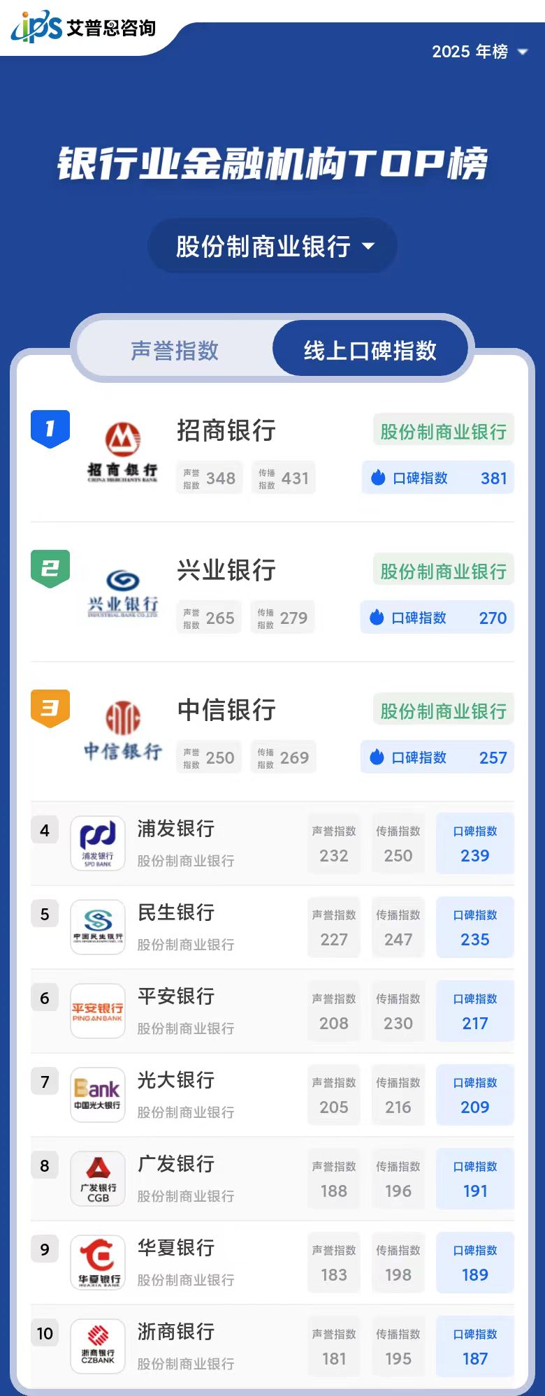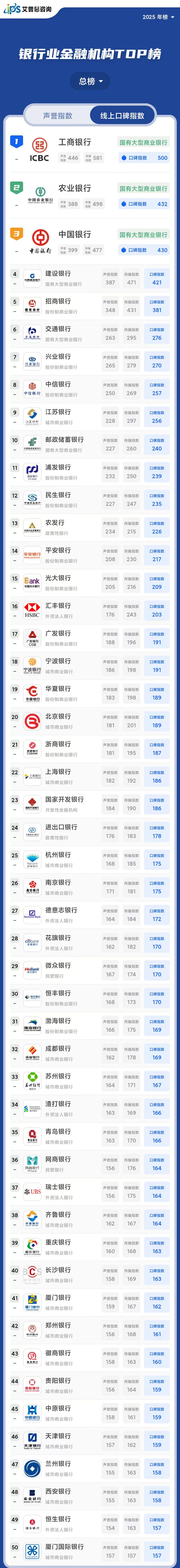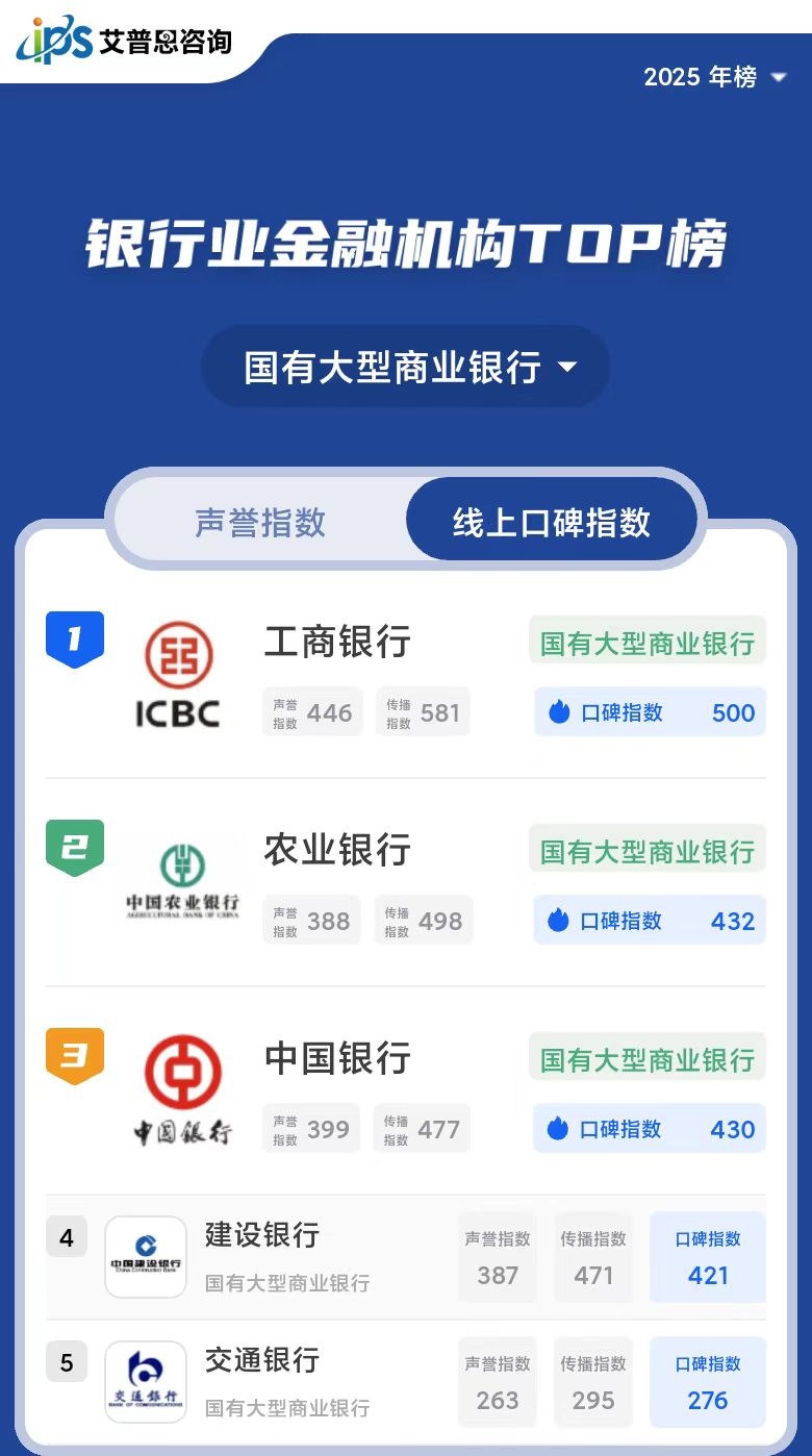2025年线上口碑指数排名前三的银行业金融机构为:工商银行(国有大型商业银行,口碑指数500)、农业银行(国有大型商业银行,口碑指数432)、中国银行(国有大型商业银行,口碑指数430)。