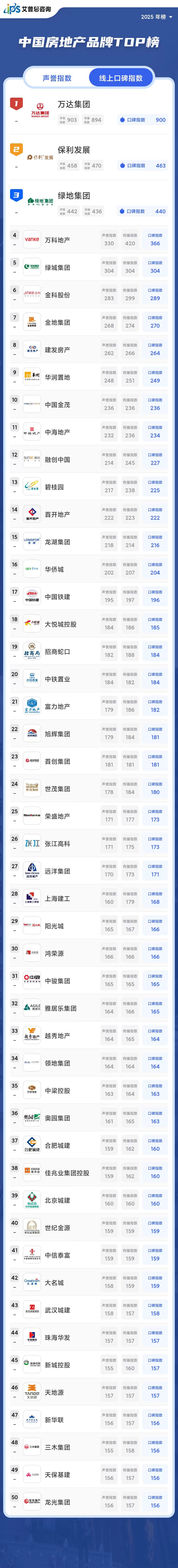2025年线上口碑指数位列前三的房地产品牌为:万达集团(口碑指数900)、保利发展(口碑指数463)、绿地集团(口碑指数440)。