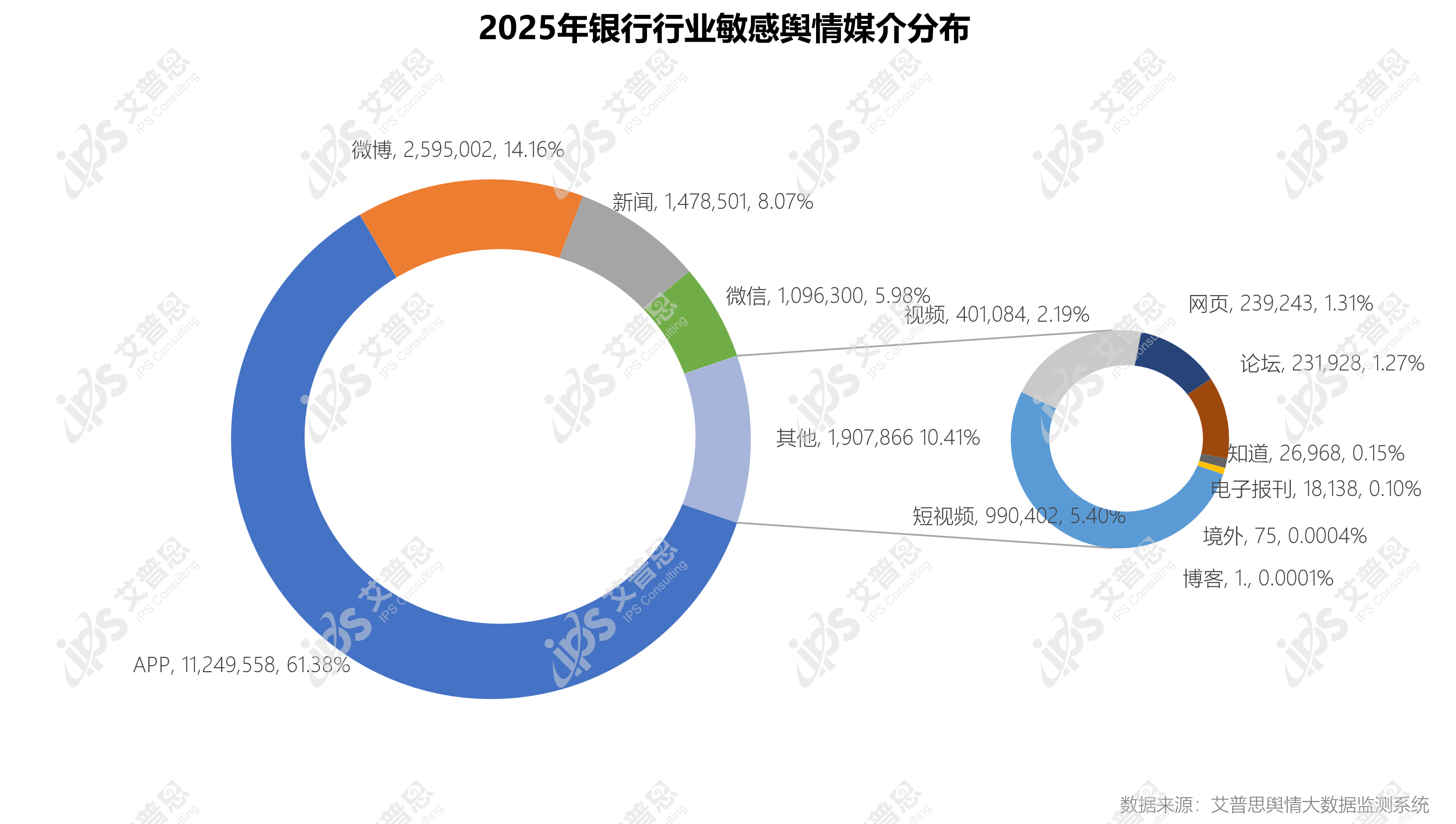 2025年,银行业敏感舆情声量来源中,占比最高的媒介为APP,达61.38%,舆情声量为11,249,558篇次;其次为微博,舆情声量达2,595,002篇次,占比14.16%;排名第三的为新闻,舆情声量为1,478,501篇次,占比8.07%;第四为微信,舆情声量为1,096,300篇次,占比5.98%;其他媒介中,短视频、网页、论坛等媒介的总占比达10.41%,舆情声量为1,907,866篇次。