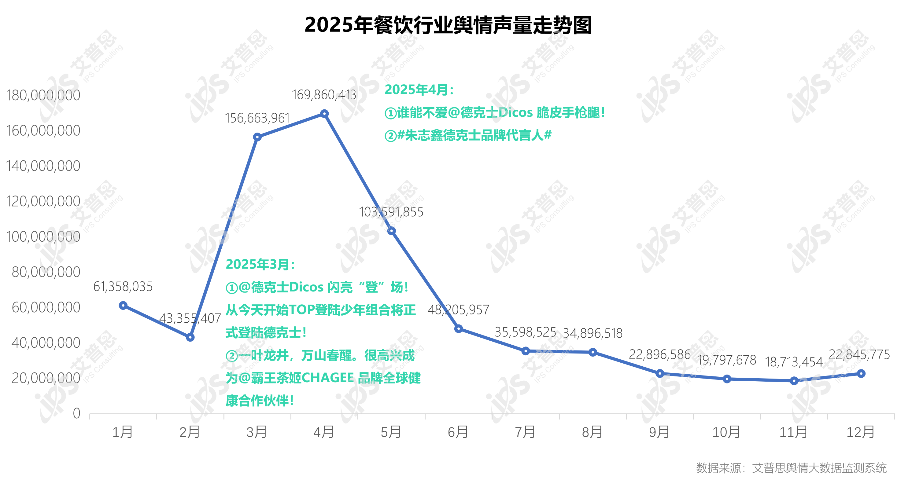 艾普思舆情大数据监测系统显示,2025,涉及餐饮行业的舆情声量为737,784,164篇次,月均声量达61,482,013篇次。从声量走势来看,2025年餐饮行业舆情声量最高峰峰为4月份,主要由话题“谁能不爱@德克士Dicos 脆皮手枪腿!” 及“#朱志鑫德克士品牌代言人#” 带动声量;