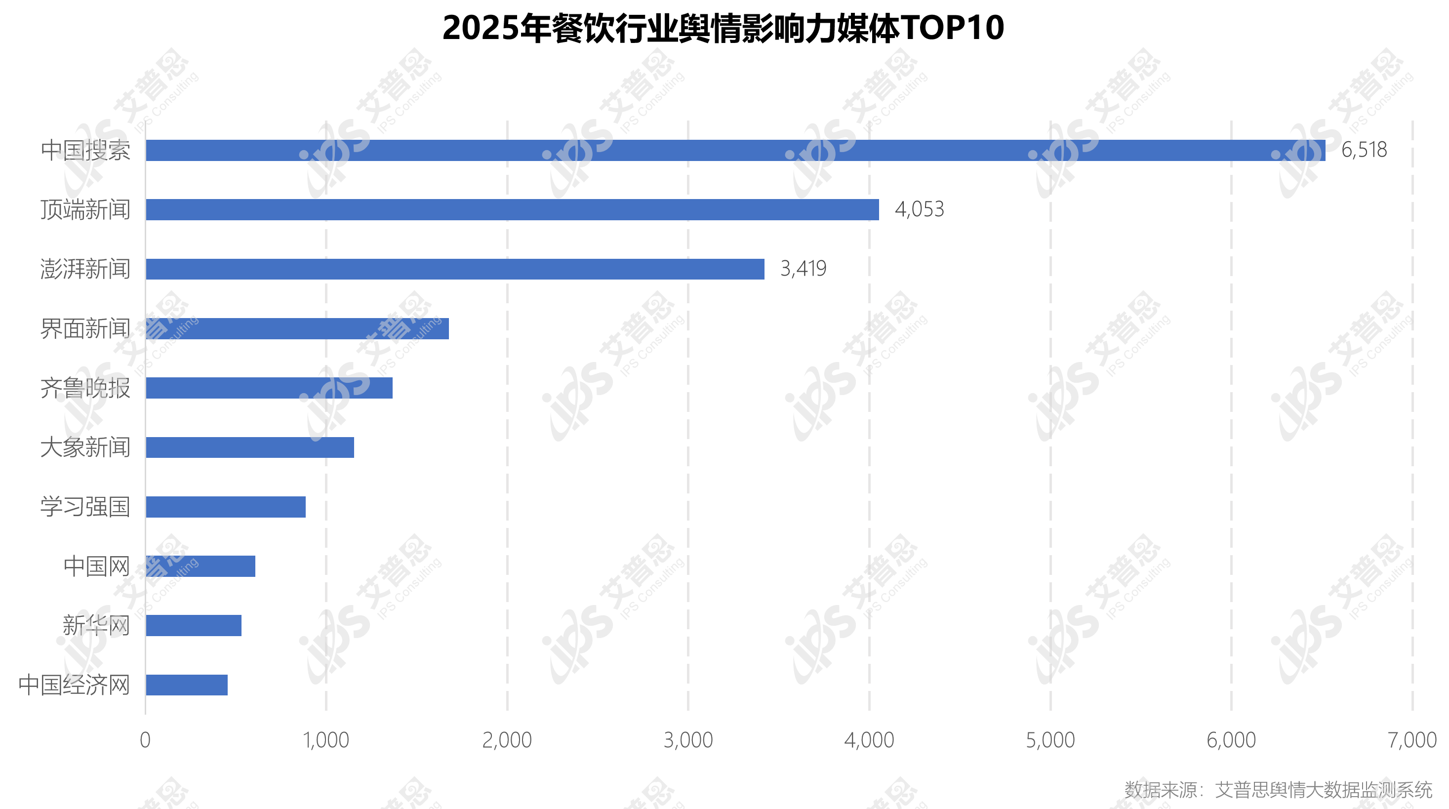 2025年,餐饮行业媒体舆情影响力排名最高的为中国搜索,其次为顶端新闻,第三名为澎湃新闻。排名前十的媒体有: