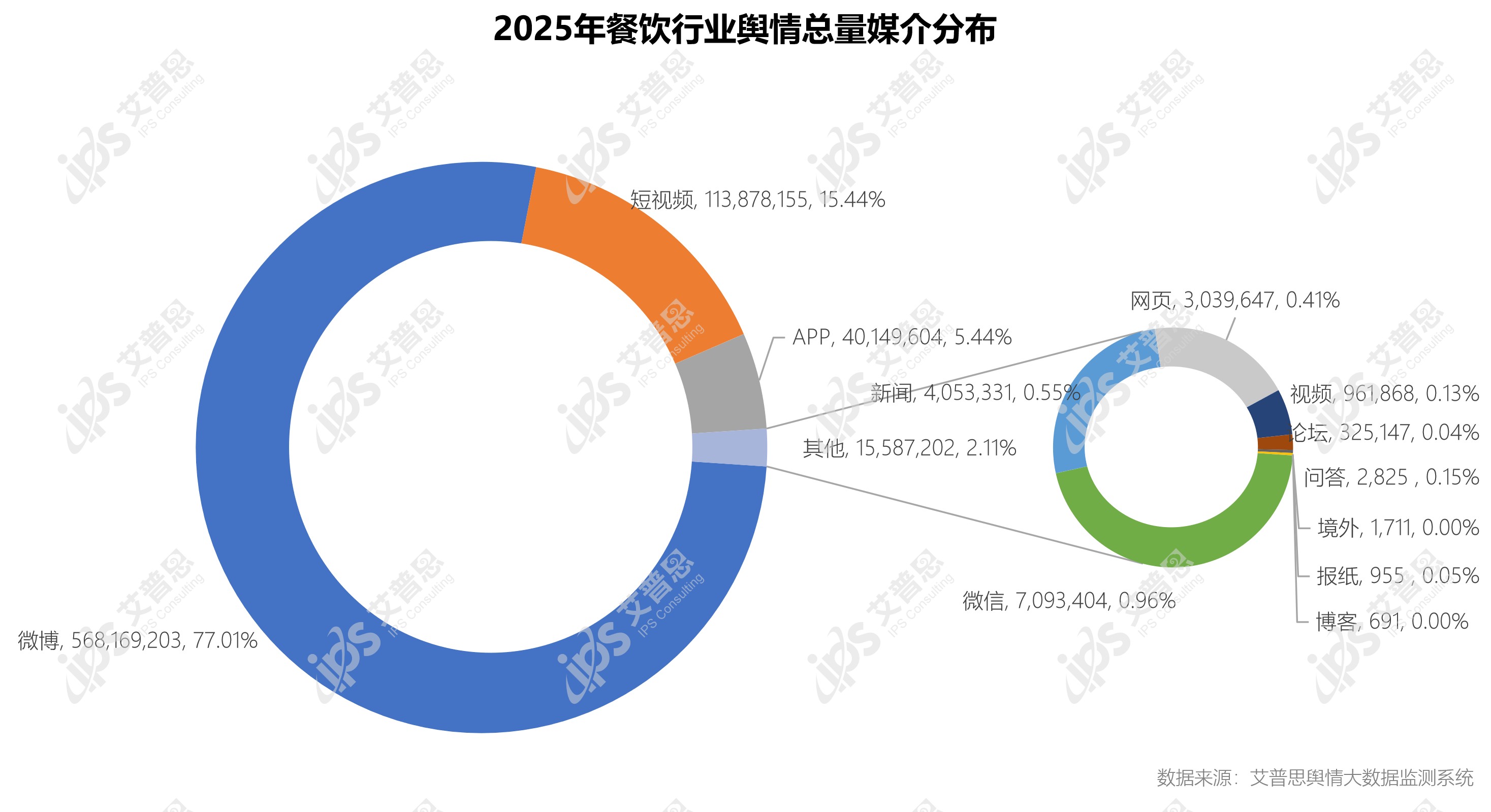 2025年,餐饮行业舆情声量来源中,占比最高的媒介为微博,达77.01%,舆情声量为568,169,203篇次;其次为短视频,舆情声量达113,878,155篇次,占比15.44%;排名第三的是APP,舆情声量达40,149,604篇次,占比5.44%。